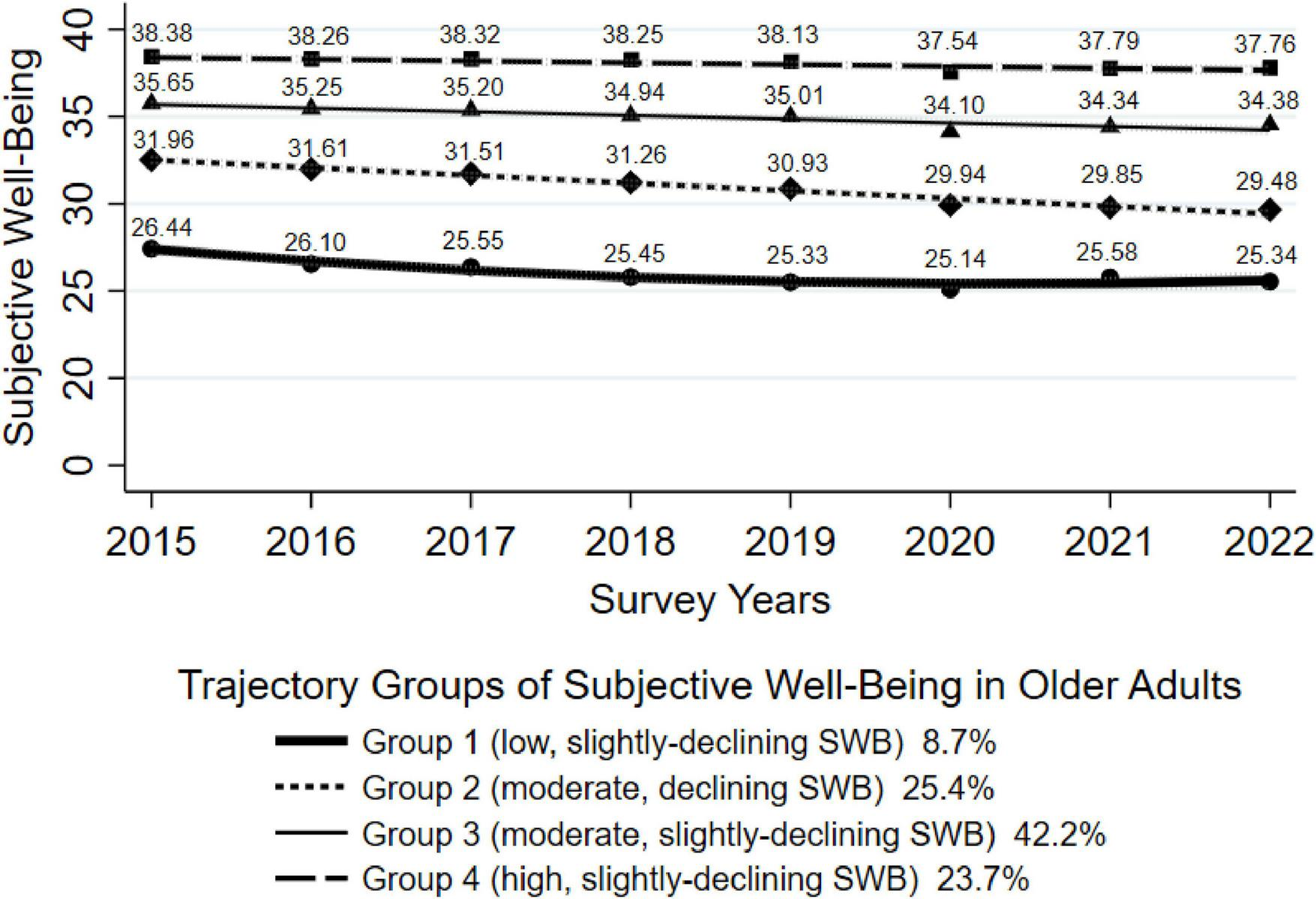 Therefore, drawing on nationally representative longitudinal data, this study aimed to (1) identify distinct trajectories of SWB in older adults using GBTM and (2) examine how anxiety/depression levels were associated with these developmental trajectories.