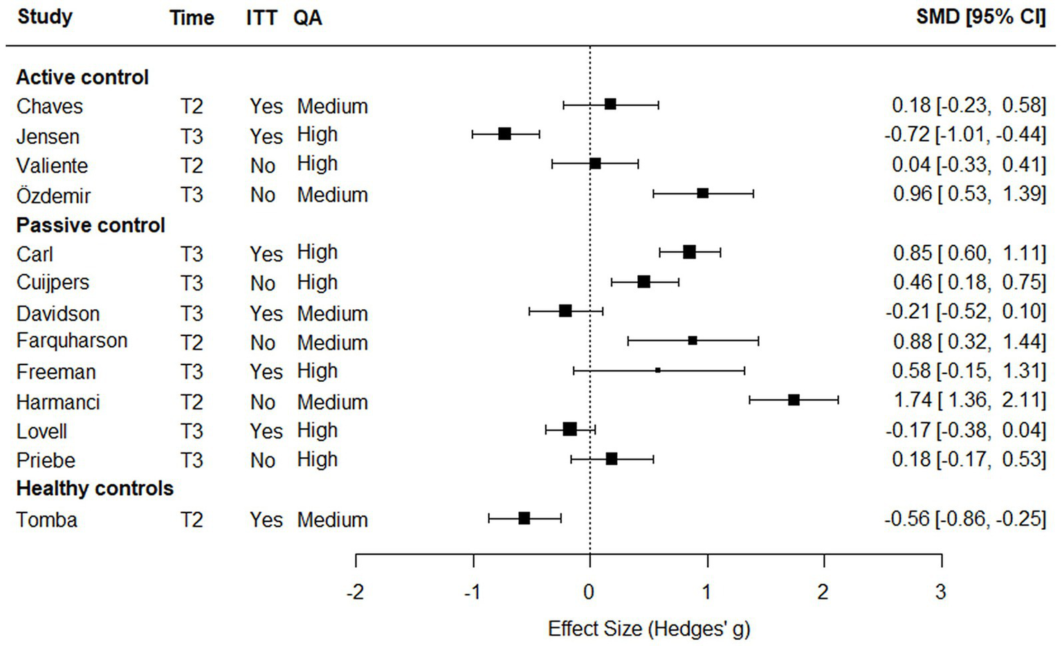 Comparison: Eligible studies were required to use a randomized controlled trial (RCT) design or a quasi-experimental (QE) design. Control conditions were classified as active if participants received any form of treatment beyond monitoring; otherwise, they were classified as passive.