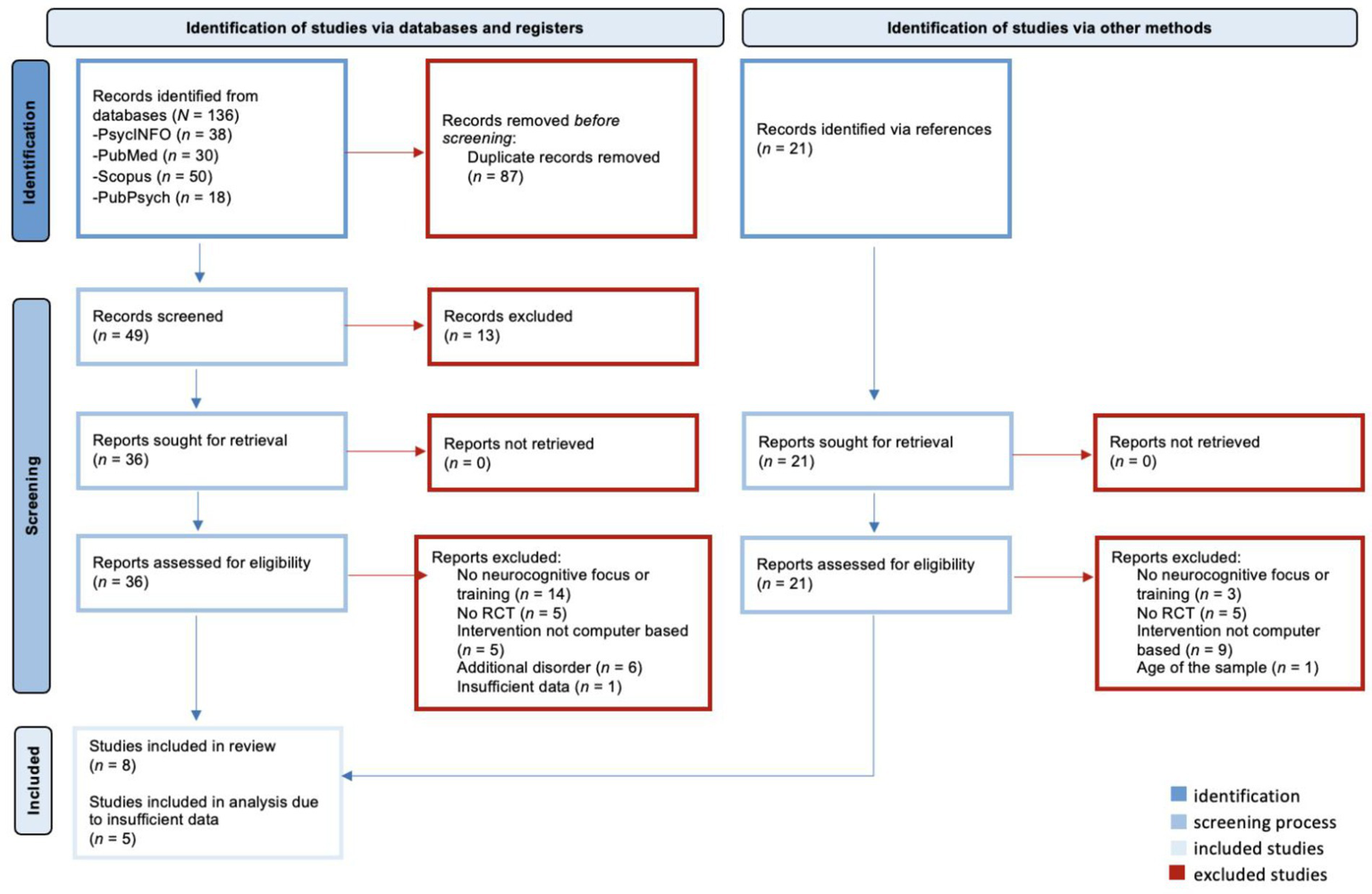 For this systematic review and meta-analysis, studies had to be published in English in a peer-reviewed journal and focus on adults (aged > 18 years), whether civilians or military servicemember, affected by PTSD and other deployment-related psychiatric disorders such as depression or anxiety disorder. Inclusion criteria required studies to be RCTs and to involve c-bnt. The search was conducted across the databases PsycINFO, PubMed, Scopus, and PubPsych and was conducted from February 1st, 2023, to June 30st, 2025. Additionally, cross-references from selected studies were reviewed. The electronic search term was: TI = [(PTSD OR “posttraumatic stress disorder” OR “post-traumatic stress disorder” OR “combat PTSD”) AND (attention OR learning OR memory OR inhibition OR cognition OR “computer-based”) AND (intervention OR training)]. The inclusion and search strategy were guided by the PICOS framework: Population – adults diagnosed with PTSD (with or without comorbid depression); Intervention – computer-based neurocognitive training; Comparison – control groups such as waitlist, placebo or active control conditions; Outcomes – PTSD symptom severity, depressive symptoms, executive functions (e.g., cognitive flexibility, working memory, inhibition); Study design –RCTs.