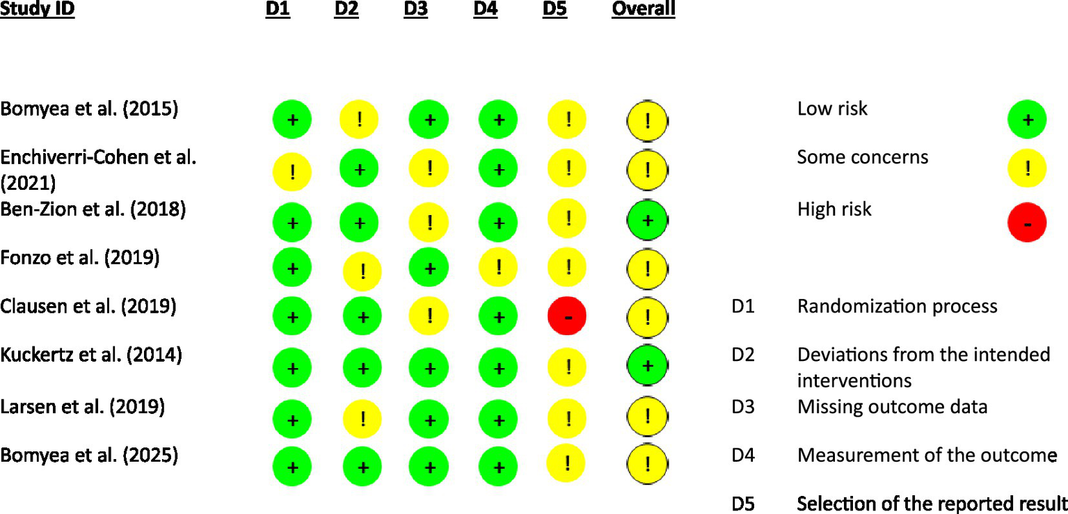 The risk of bias was assessed using the Cochrane Risk-of-Bias Tool for Randomized Trials (RoB2) (Higgins et al., 2019). The analysis of the randomization process indicated a low risk of bias in seven studies (Fonzo et al., 2019; Bomyea et al., 2015; Clausen et al., 2019; Ben-Zion et al., 2018; Kuckertz et al., 2014; Larsen et al., 2019; Bomyea et al., 2025). Deviations from intended interventions showed a low risk in five studies (Clausen et al., 2019; Echiverri-Cohen et al., 2021; Ben-Zion et al., 2018; Kuckertz et al., 2014; Bomyea et al., 2025), while Bomyea et al. (2015), Fonzo et al. (2019), and Larsen et al. (2019) raised some concerns at this level. For missing outcome data, Bomyea et al. (2015), Bomyea et al. (2025), Fonzo et al. (2019), Kuckertz et al. (2014), and Larsen et al. (2019) were assessed as having a low risk of bias. However, concerns were noted in the studies by Echiverri-Cohen et al. (2021), Ben-Zion et al. (2018), and Clausen et al. (2019). Regarding outcome measurement, only Fonzo et al. (2019) raised some concerns, while the other seven studies had a low risk.