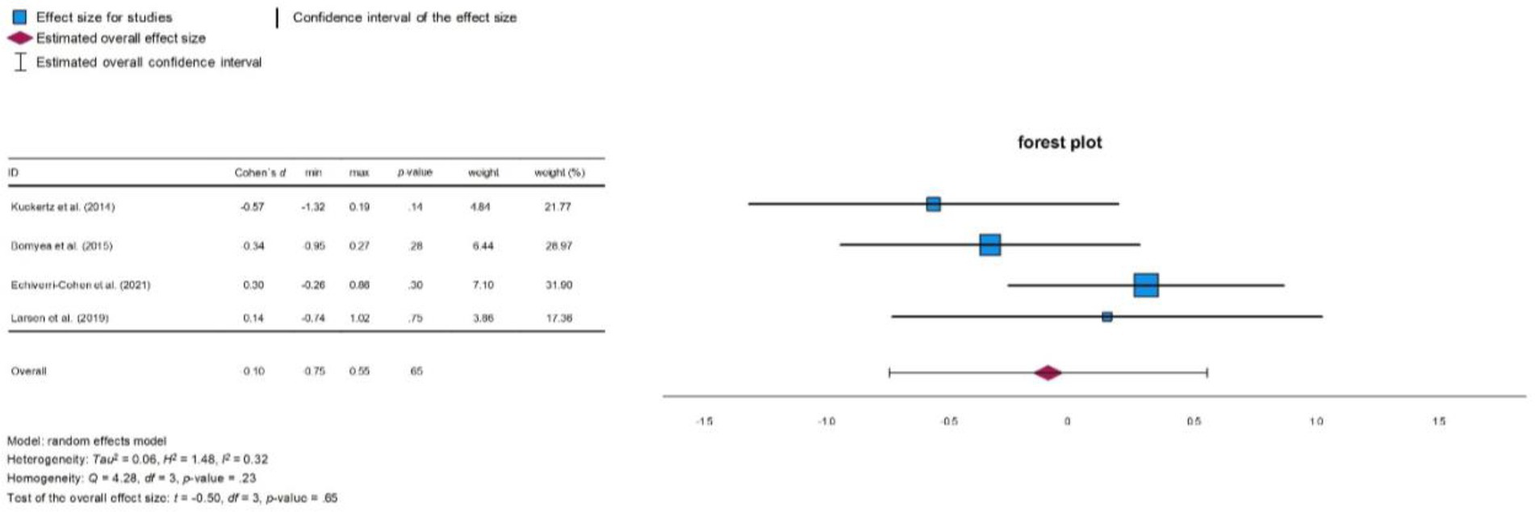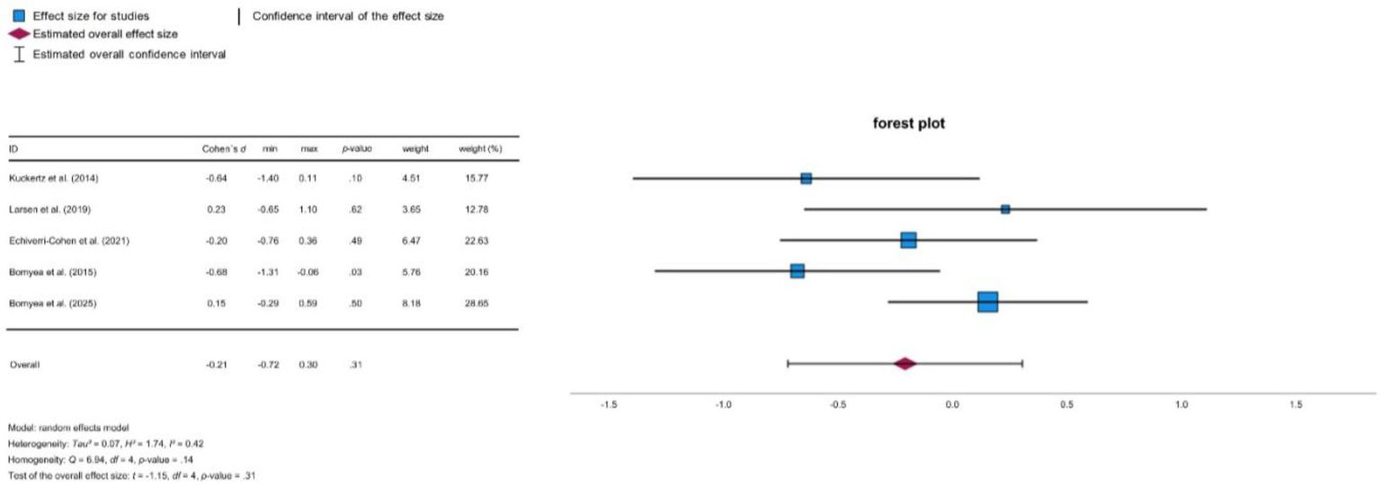 In Analysis 2, which examined the influence of neurocognitive training on depressive symptoms, the studies Kuckertz et al. (2014), Larsen et al. (2019), Echiverri-Cohen et al. (2021), and Bomyea et al. (2015) were included (for means and standard deviations see Table 3). The results across the studies varied. Some reported improvements in the severity of depressive symptoms in the training group, while others found no significant changes.
