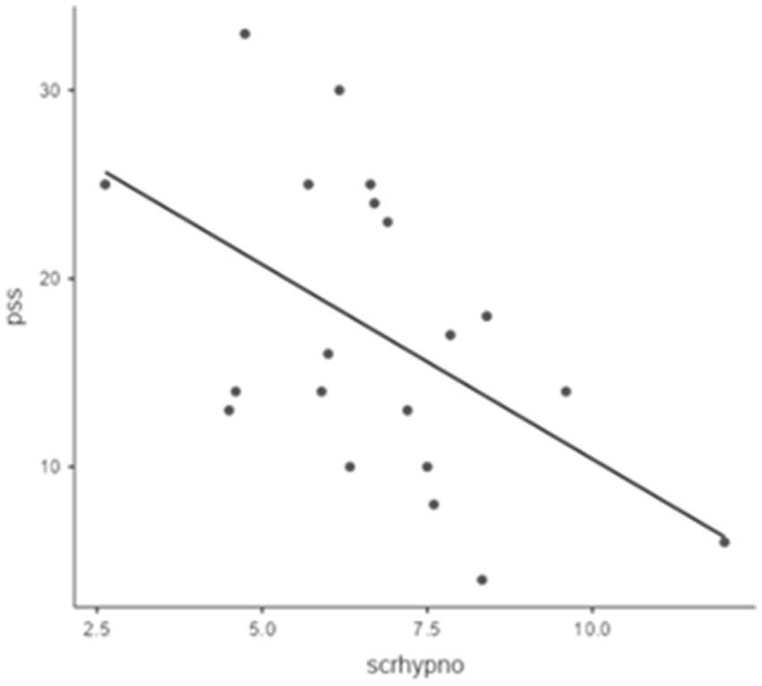 Correlation between SCR hypno and PSS-10 scale: Pearson’s (R = −0,517, DF = 18, p = 0.019).