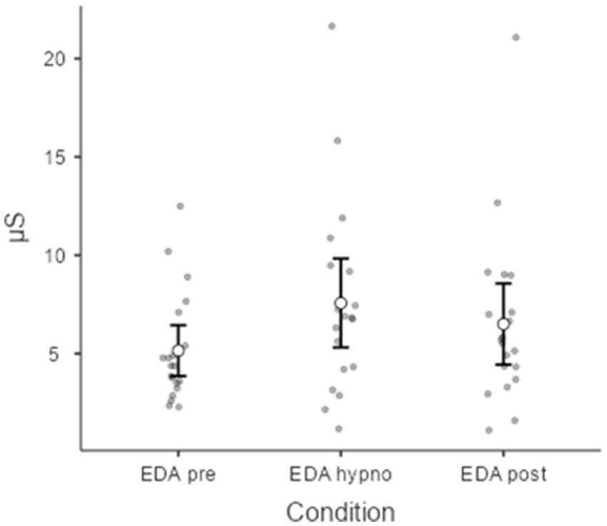 EDA was not normally distributed. The analysis revealed a slight increase in EDA during hypnosis, followed by its marked decrease in the post condition (Wilcoxon = 50, DF = 18, p = 0.0035), while Friedman’s ANOVA was significant (p = 0.015). Post-hoc comparison using Durbin–Conover tests showed a difference between EDA pre vs. hypno (p = 0.003) and hypno vs. post (p = 0.044) (Figure 3). No effect of the condition (pre, hypnosis, or post) on HRV was found; however, the result of ANOVA for repeated measurements was close to the significance level (p = 0.054).