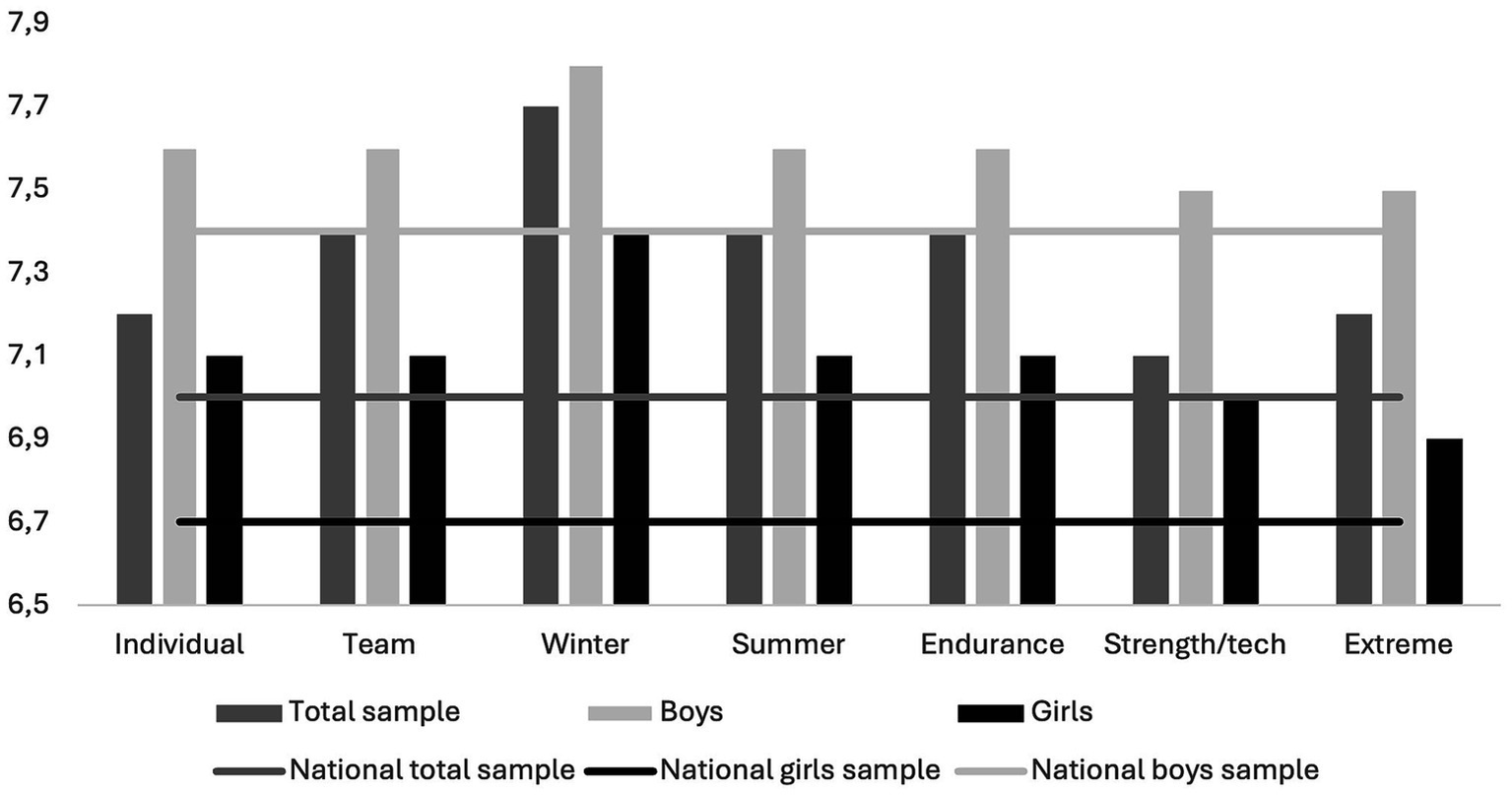 Cross-sectional data was derived from the Norwegian Youngdata Survey, collected with nationwide representation, aggregated from 2021 to 2023. A total of 26.171 adolescents aged 16 to 19 years were included, derived from 18 sports disciplines (e.g., football, handball, etc.) and grouped into categories (e.g., endurance sports, team sports, etc.). Comparisons to national data (N = 109.469) were conducted using summary data t-tests.