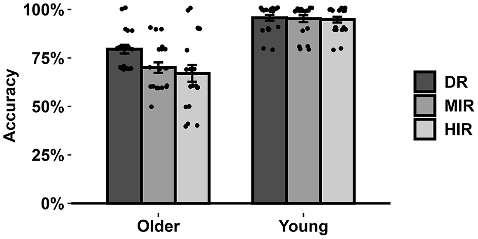 The mean accuracy rates from reading comprehension task in older and young adults. Error bars denote between-subject standard errors.