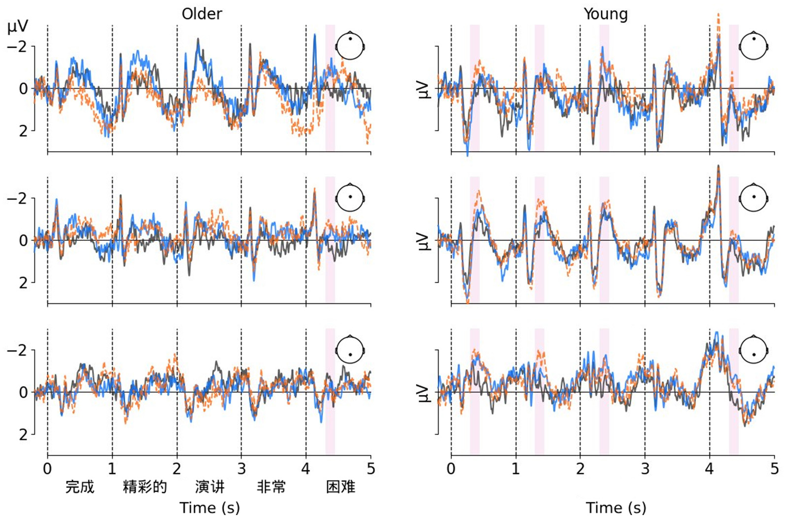 To analyze EEG data, a 0.5–40 Hz band-pass filter was used with the average of the whole brain as a reference. Independent component analysis (ICA) was measured to delete eye-movement artifacts for EEG data. We truncated the time period of 200 ms before the presentation onset of the first phrase of the reply to 5,000 ms after it for analysis. We used the 200 ms of EEG activity preceding first phrase onset as a baseline to measure the ERP data of each participant. To elaborate, each reply was divided into five phrases, with the first three phrases forming the subject (early-to-mid stage) and the last two phrases forming the predicate (late stage). Each phrase was displayed for 500 ms, followed by a 500 ms blank screen. This means that after one phrase appeared, the next phrase would be presented after a total of 1,000 ms (500 ms presentation + 500 ms blank). The complete presentation of the reply, which included all five phrases, thus took a total of 5,000 ms. This 5,000 ms period was the critical window for EEG recording, during which we captured the neural responses to the sequential presentation of the phrases. Nine electrodes (F3, Fz, F4, C3, Cz, C4, P3, Pz, P4) were selected for further analysis, as their coverage over frontal, central, and parietal regions is consistently implicated in generating N400/LPC effects during language comprehension (e.g., Kutas and Federmeier, 2011; Coulson and Lovett, 2010). Artifacts with the criteria of ± 100 μV were removed during data averaging. Thus, the number of trials in averaging was 26.1 under the DR condition, 25.9 under the MIR condition and 25.7 under the HIR condition for the older group, while that was 27.1 under the DR condition, 27.1 under the MIR condition, and 27.0 under the HIR condition for the young group. At least 18 trials were averaged under each condition among each participant. Analyses were conducted on the mean amplitude values in the following two time-windows: 300–450 ms, and 700–1000 ms after every phrase in the reply sentence, based on the observation of waveforms and previous studies.
