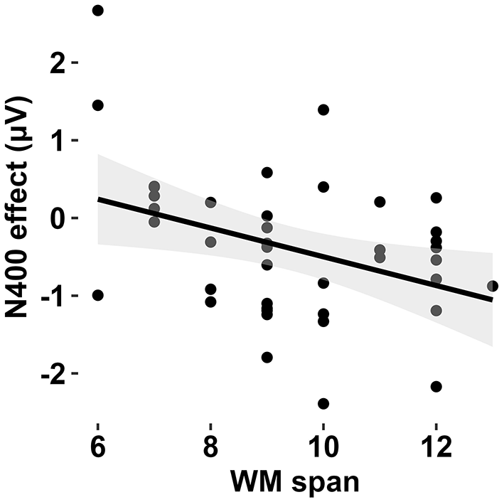 The correlation between working memory span and the N400 effects elicited by indirect reply for the second phrase.