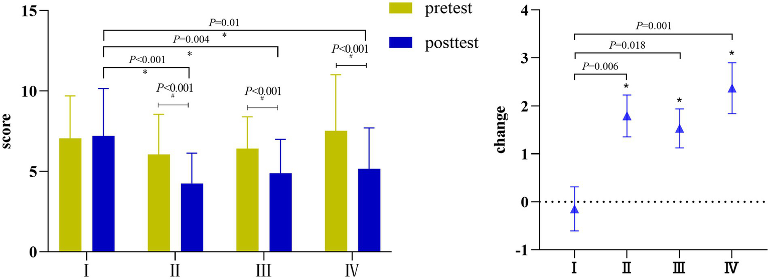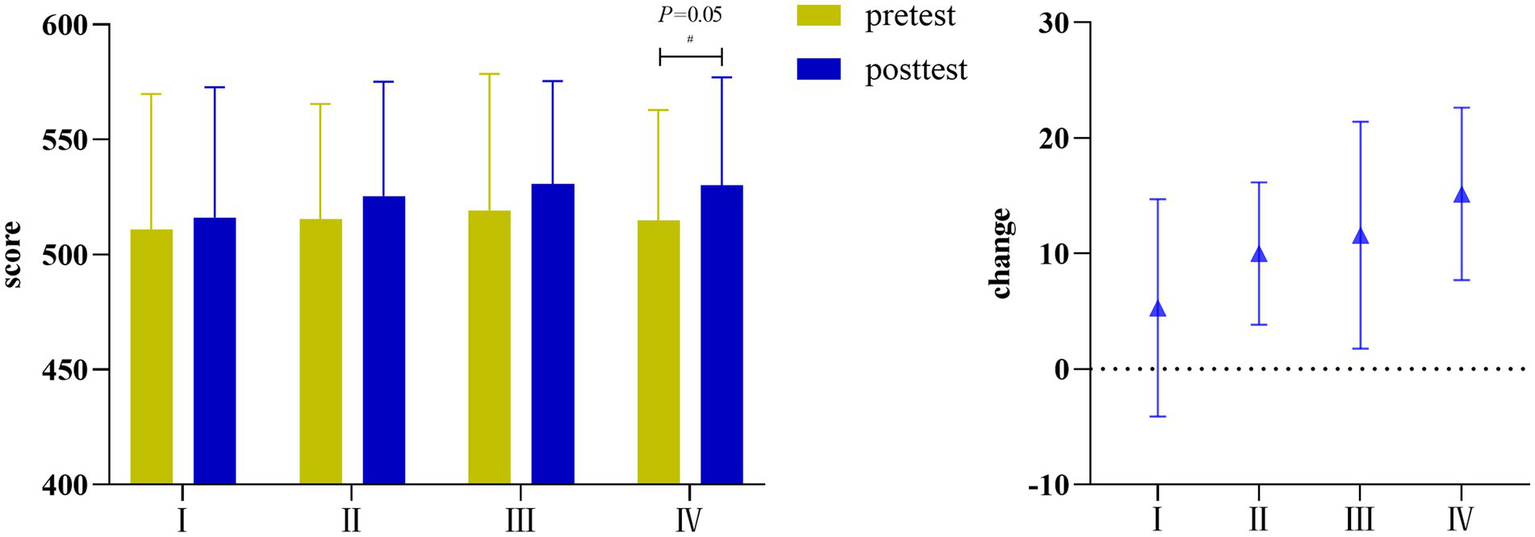 After training, the Kruskal-Wallis H test showed that there was a significant difference in the reduction of PSQI global scores between the groups (H = 13.326, p = 0.004). The Bonferroni method was used to correct the post-hoc pairwise comparison of the significance level. It was found that the reduction values of Group II, Group III and Group IV were significantly higher than those of Group I (p = 0.006, p = 0.018, p = 0.001, respectively), while there was no significant difference between Group II, Group III and Group IV. The order of change value was Group IV > Group II > Group III > Group I.