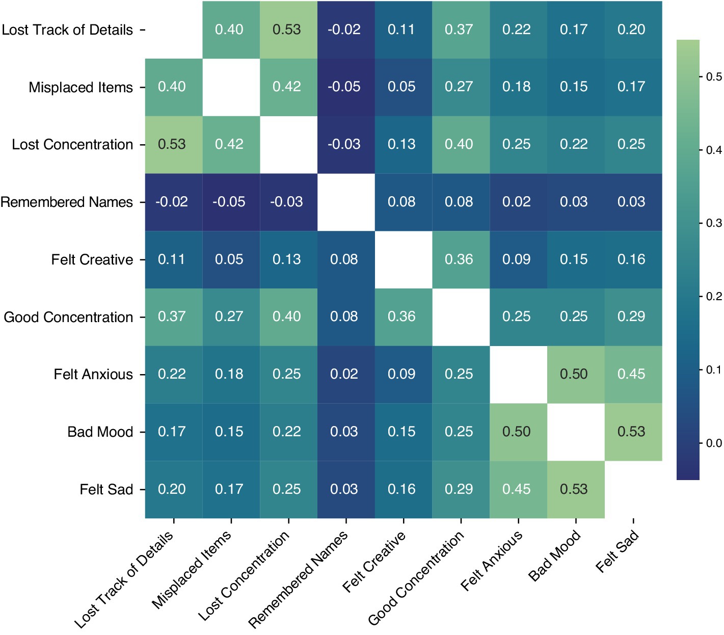 Survey results from the Healthy cohort (N = 75,019) had varying degrees of inter-item (pairwise) correlation, ranging from −0.05 to 0.53, as shown in Figure 1. All correlations were significantly different from 0 (with bootstrapped 95% confidence intervals) at the p < 0.0001 level. Item-total correlations ranged from 0.03 (“Remembered Names”) to 0.52 (“Good Concentration”) and were all significantly different from 0 (p < 0.0001 for all items). Cronbach’s alpha for the full survey was 0.705 (0.702–0.708). Bartlett’s test of sphericity was significant (T = 136408.60, p < 0.0001), and the KMO statistic was acceptable at 0.77, above the commonly recommended threshold of 0.70 (Hoelzle and Meyer, 2013; Lloret et al., 2017). These results indicate strong factorability and sampling adequacy in the data set.