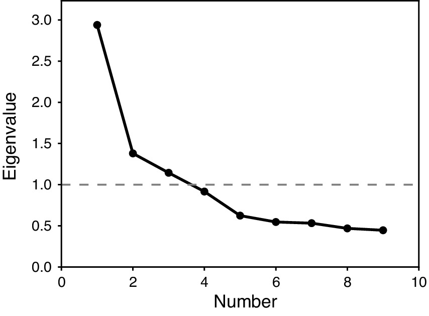 Figure 2. Scree plot for exploratory factory analysis of the original nine-item survey in Study 1. X-axis shows factor number and Y-axis shows eigenvalue. The dotted line with 1.0 is the cutoff for inclusion in the factor solution.