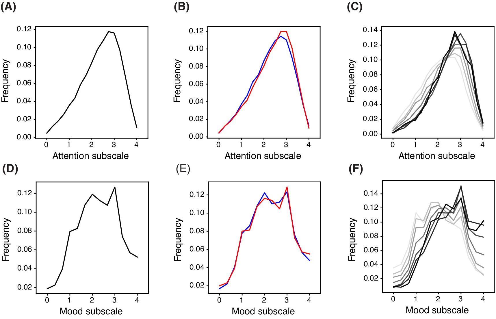 Six line graphs labeled A to F display frequency versus subscale scores. A, B, and C show attention subscales, while D, E, and F show mood subscales. Graphs A and D are single black lines, B and E have blue and red lines, and C and F feature multiple black lines. The x-axis ranges from zero to four, depicting scores, with varying frequencies on the y-axis.