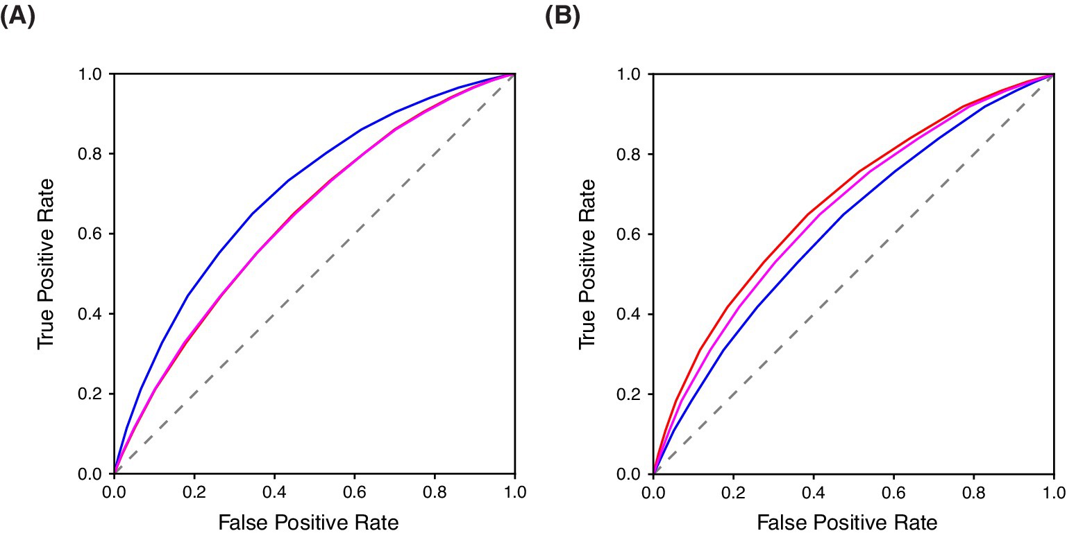 Two ROC curve graphs labeled A and B compare different models. Both plots show true positive rates against false positive rates. Each graph has red, pink, and blue lines. Each graph includes a diagonal dotted line representing random classification.