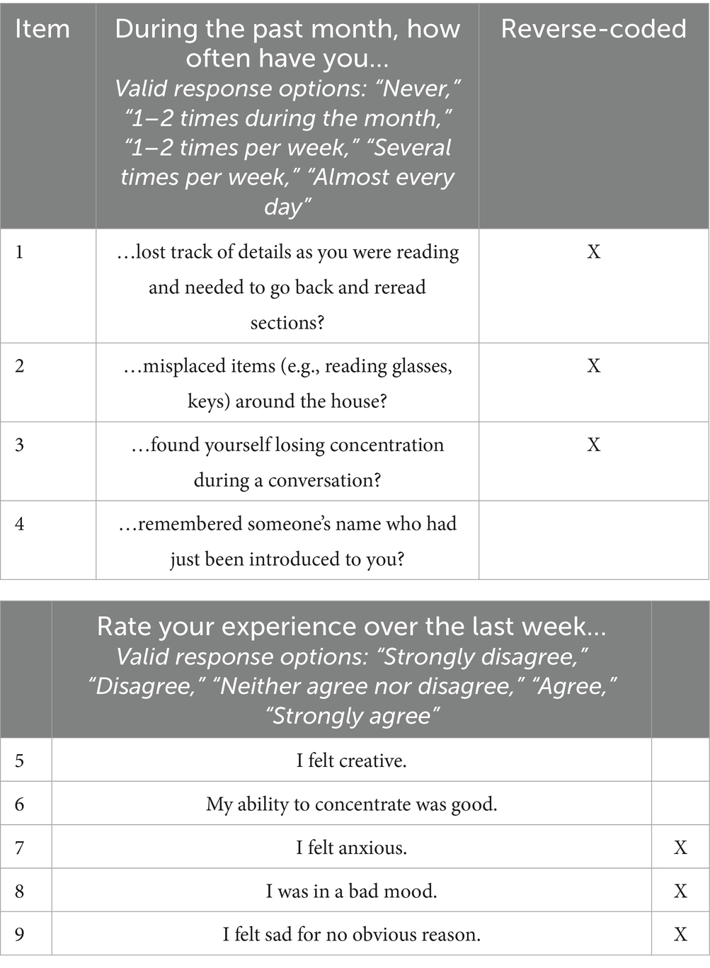In 2015, Hardy et al. (2015) published the results of a large, online study evaluating an at-home, computerized cognitive training program [described also in Ng et al. (2021)]. As a secondary outcome measure, the authors created a nine-item survey of “cognitive failures and successes as well as emotional status” [p. 6; 45]. This original survey is shown in Table 1 and consisted of two parts. In a first section of four items, participants responded to questions about the frequency of real-world cognitive failures or successes within the last month. In a second section of five items, participants responded to questions about the extent of agreement with statements relating to feelings of positive or negative mood and emotions, creativity, and concentration within the last week. Responses were on a five-point Likert scale and translated to score values of 0 to 4. Hardy et al. (2015) created a composite measure – the “aggregate rating” – by averaging across items.
