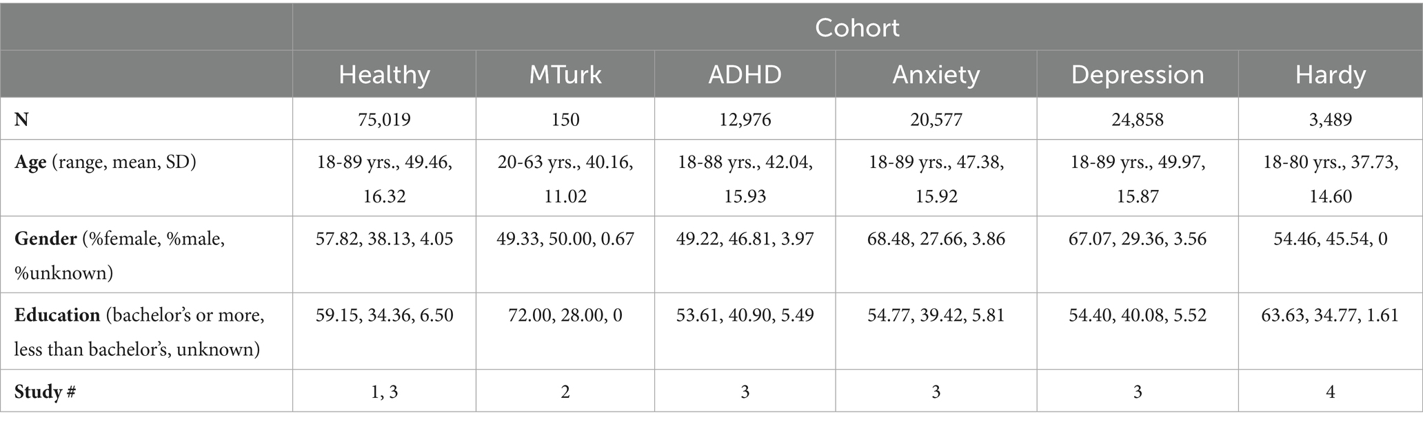For the Healthy, ADHD, Anxiety, Depression, and Hardy cohorts, all data from participants with complete responses was analyzed, and thus the size of the population was very large. Because these were descriptive studies with pre-existing data sets, powering was not calculated; in addition, the size of each population was much larger than is commonly recommended (see (Kyriazos, 2018; Tabachnick and Fidell, 2013)). For the MTurk cohort, which was also a descriptive study, a power analysis indicated that 134 participants would be sufficient to detect correlations between measures with 95% power, two-tailed at p < 0.05, with expected correlation strength r = 0.30 (G*Power 3.1) (Faul et al., 2009). To account for potential quality issues with remote research platforms such as MTurk (Goodman and Wright, 2022; Chmielewski and Kucker, 2020; Peer et al., 2022), our prespecified methods allowed for recruitment of up to 200 participants, with the expectation that up to 1/3 of the collected data would need to be discarded due to failed attention checks.