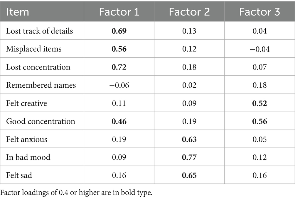 Then, the results of the 3-factor solution were computed as shown in Table 3, with factor loadings of 0.4 or greater in bold type. As expected, several of the items related to cognitive successes and failures loaded together, as did several of the items related to mood. The “Remembered Names” item did not load significantly onto any of the three factors, and was dropped. The “Good Concentration” item was the only one to load strongly onto multiple factors: both the first factor, which included other items related to cognitive failures primarily associated with attention functioning, and the third factor, which included the “Felt Creative” item.