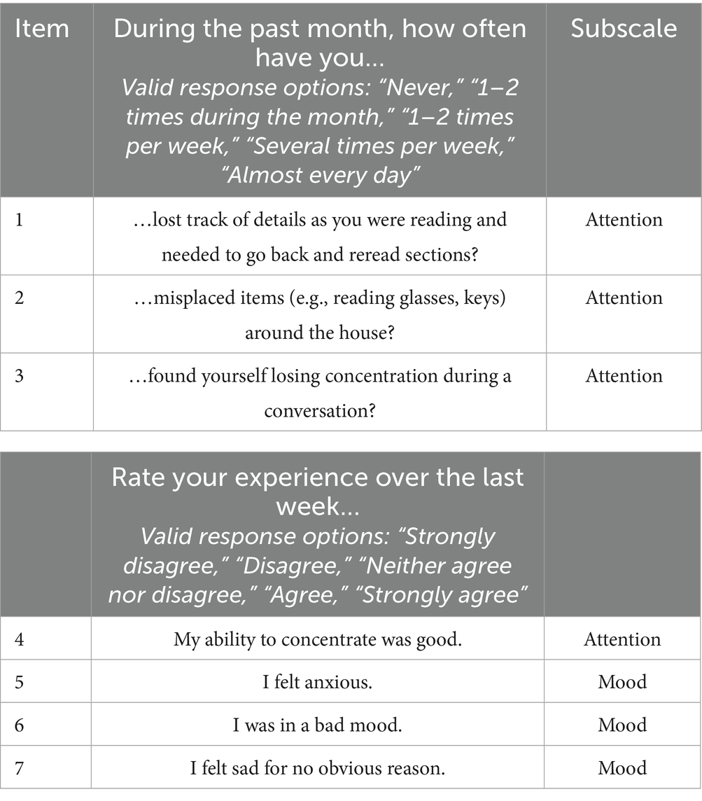 Intersecting with the need for concurrent measurement of cognition and mood is a shifting research landscape. Due to advances in technological capabilities, changes in emphases in regulatory guidance, and lasting impacts of the COVID-19 pandemic, there has been a recent surge of online studies in the social and clinical sciences (Arechar and Rand, 2021; Goodman and Wright, 2022; Lourenco and Tasimi, 2020; Saragih et al., 2022). Related to this point is a growing body of contemporary research indicating that the psychometric properties of survey instruments may indeed be impacted by factors such as mode of administration and length (Aiyegbusi et al., 2024; Aiyegbusi et al., 2022; Gottfried, 2024; Kelfve et al., 2020; Lantos et al., 2023; Zager Kocjan et al., 2023; Wilson et al., 2024). As a result, instruments that are designed and characterized specifically for online research are paramount. To collect reliable responses from large numbers of participants via their own internet-connected devices, instrument qualities like brevity and accessibility of language are likewise required. For studies using relatively brief interventions, the time interval for evaluation is also important: for example, using Broadbent’s Cognitive Failures Questionnaire (CFQ) [e.g., Bridger et al. (2013), Broadbent et al. (1982), Goodhew and Edwards (2024), and Rast et al. (2009)] to evaluate cognitive failures over the past six months may not be appropriate for measuring change over a shorter period of time. Furthermore, instruments that have been normed and validated based on traditional, in-person administration may have different characteristics with at-home, self-administration on one’s own computer or smart device.