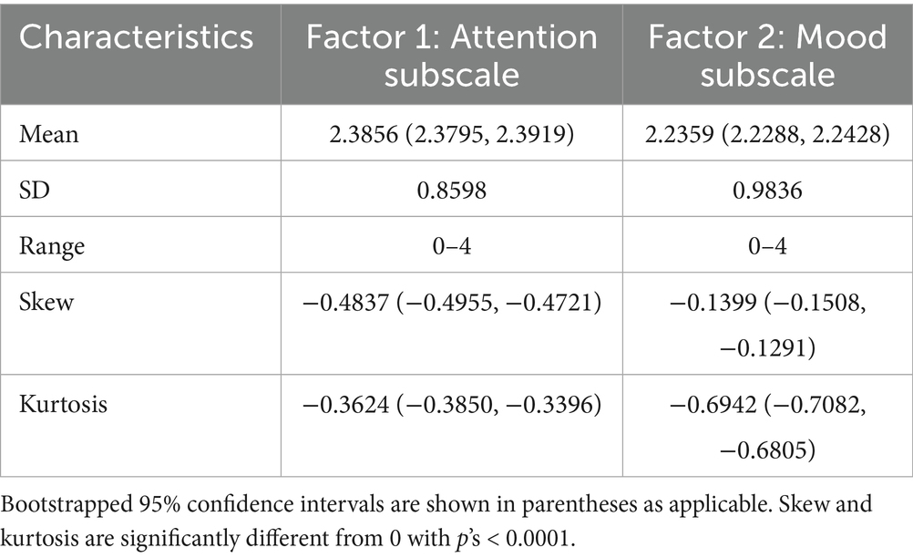 Both of the subscales are related to the demographic variables of gender and age in some way. With one-way ANOVAs, the Attention subscale significantly varied with gender (MeanMale = 2.3608, MeanFemale = 2.4011, MeanUnknown = 2.3981; F = 19.31, p < 0.0001) while the Mood subscale did not (MeanMale = 0.9727, MeanFemale = 0.9912, MeanUnknown = 0.9785; F = 1.33, p = 0.27). With correlation tests, both subscales were positively associated with age within the measured range (18–89 years) (Attention: r = 0.1994, p < 0.001; Mood: r = 0.2285, p < 0.001). While an age-related increase on the Attention scale may be surprising given the well-established decline in cognitive performance during aging, this finding is consistent with the characteristics of the CFQ [see Rast et al. (2009) and de Winter et al. (2015); for similar results with additional questionnaires, see Cyr and Anderson (2019) and Tassoni et al. (2022)]. It is also consistent with the hypothesis that self-reported cognitive failures and successes may reflect something distinct from what is measured via objective cognitive tests (Eisenberg et al., 2019; Yapici-Eser et al., 2021).