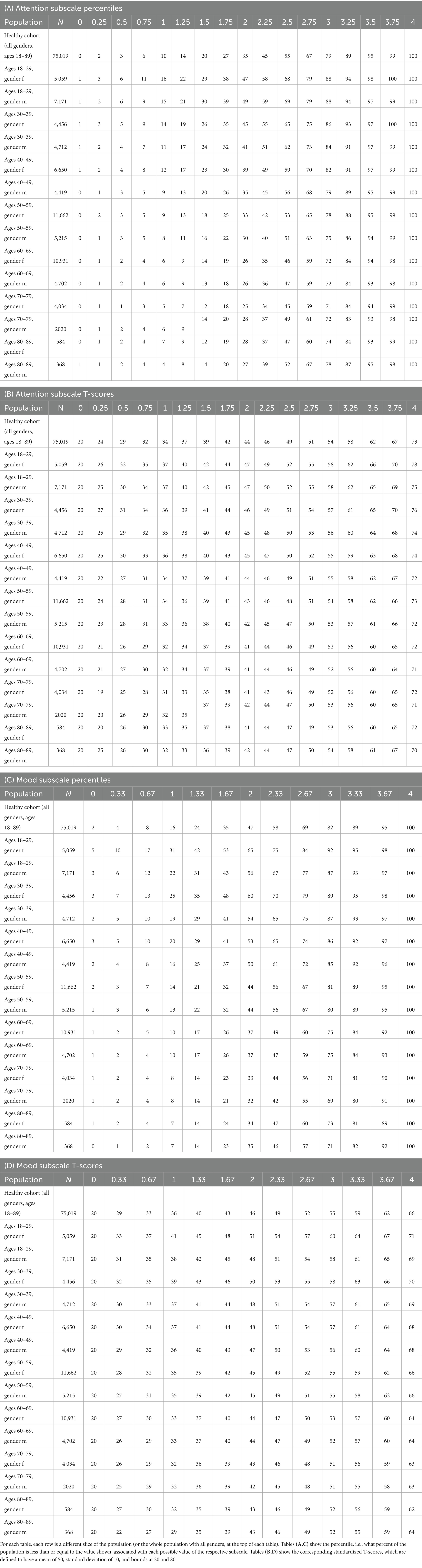 Norm tables providing percentiles and standardized T-scores across the whole population, by gender, and by age in decade are also provided in look-up format for the Attention subscale (Tables 6A,B) and Mood subscale (Tables 6C,D). T-scores provide conversions to a normal distribution with mean 50, standard deviation 10, and bounds at 20 and 80.