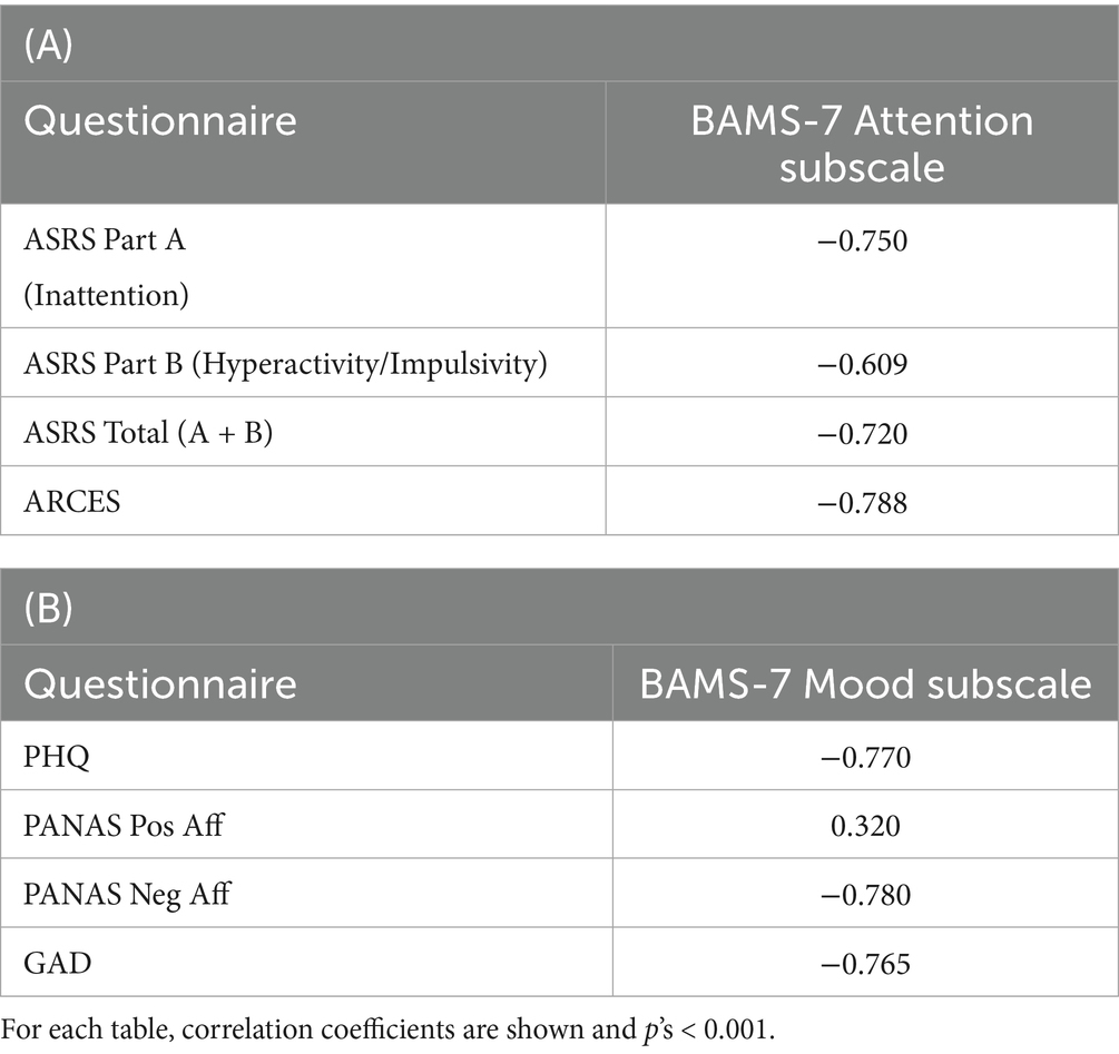 This pattern of results indicates that the BAMS-7 shows concordance with existing questionnaires. This can be seen in Supplementary Table 3, which shows the entire set of correlations between both BAMS-7 subscales and all five existing attention and mood instruments [for similar results, see Carriere et al. (2008), Franklin et al. (2017), Jonkman et al. (2017), and Schubert et al. (2024)]. The Supplementary material also contains an additional Supplementary Table 4 demonstrating strong item-level correlations between each of the BAMS-7 questions and those from the existing questionnaires with similar descriptions, demonstrating additional concordance at the item level.