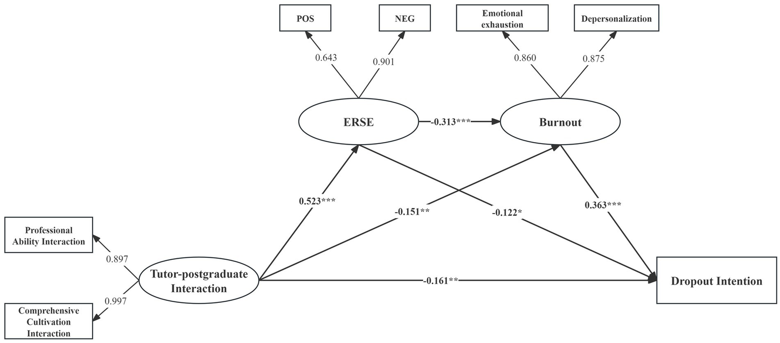 ERSE was negatively associated with burnout (r = −0.421, p < 0.01) and dropout intention (r = −0.233, p < 0.01), with ERSE_NEG showing a stronger relationship with dropout intention (r = −0.266, p < 0.01). Burnout was positively correlated with dropout intention (r = 0.304, p < 0.01). These above results indicated significant associations between independent variable (dropout intention), dependent variables (tutor-postgraduate interaction), and mediating variables (ERSE and burnout), preliminarily validating the conceptual model.