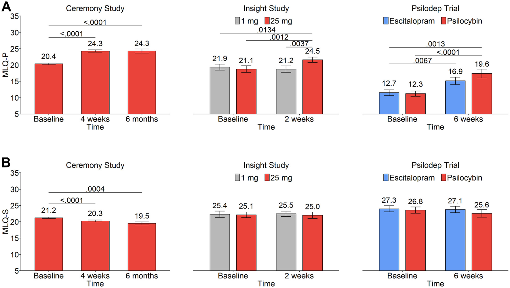 Figure 1. Scores on the MLQ before and after psychedelic use in three different studies: Ceremony study (left), Insight (center), and Psilodep (right). In all plots, bar height indicates the group mean and error bars indicate standard error. The group mean is also indicated by the value directly above each bar. Lines between bars indicate statistically significant group differences, as found from Tukey contrasts of mixed model marginal means, with the P-values indicated above the lines. (A) MLQ-P scores before and after psychedelic use in each study. (B) MLQ-S scores before and after psychedelic use in each study.