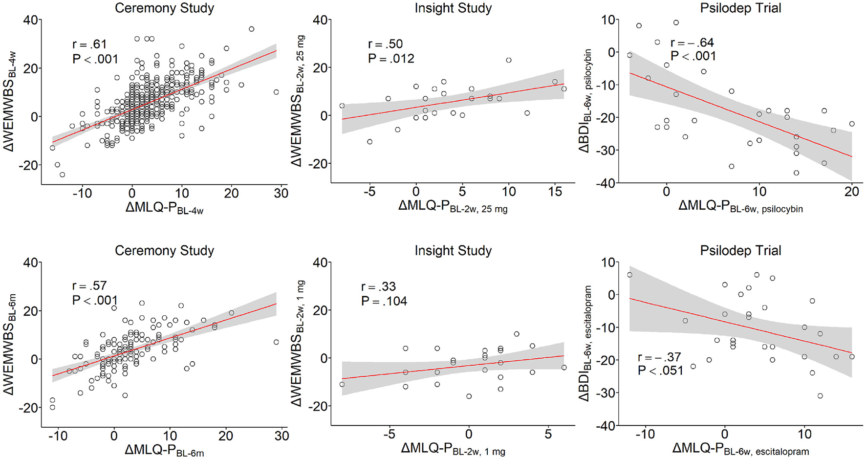 Figure 2. Correlations between changes in MLQ-P scores and changes in WEMWBS and BDI scores. Correlations with WEMWBS changes are reported for the Ceremony (left) and Insight samples (center), while correlations with BDI changes are shown for the Psilodep sample (right). In the Ceremony study, the correlations are shown for both the 4 week (top) and 6 month follow-ups (bottom). In Insight study, correlations are shown for the 25 mg (top) and 1 mg conditions (bottom). In the Psilodep trial, correlations are shown for the psilocybin (top) and escitalopram groups (bottom). In each plot, points represent individual bivariate measurements, while the red lines show an OLS linear regression with the standard error indicated by the shaded region. Pearson's r and the corresponding P-value are also shown.