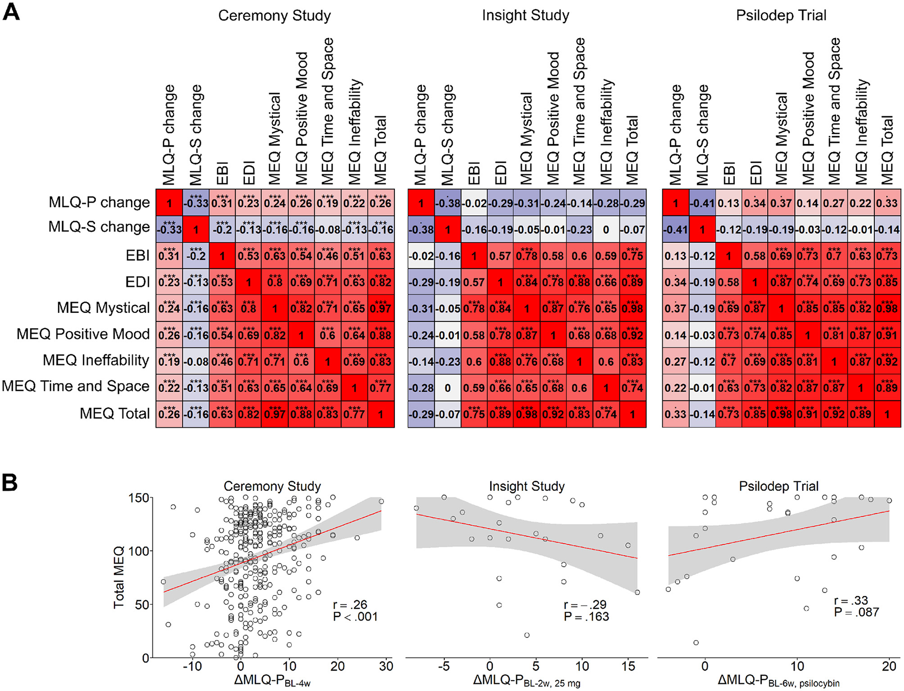 Figure 3. Correlations between acute experience measures and changes in MLQ scores. (A) Correlation matrices for changes in MLQ-P and MLQ-S scores and 7 acute experience measures: EBI, EDI, the 4 subscales of the MEQ and total MEQ scores. One matrix is shown for each study: Ceremony (left), Insight (center) and Psilodep (right). In each matrix, red values indicate positive correlations and blue values indicate negative correlations. The statistical significance is indicated by stars above each correlation coefficient, where “.” = P <0.1 and “***” = P <0.001. (B) Linear correlations between total MEQ scores and changes in MLQ-P scores before and 4 weeks after psychedelic use in the Ceremony study (left), 2 weeks after psychedelic use in the 25 mg condition of Insight study (center) and 6 weeks after psilocybin use in the Psilodep trial (right). Points represent individual bivariate measurements, while the red lines show an OLS linear regression with the standard error indicated by the shaded region. Pearson's r and the corresponding P-value are also shown in each case.