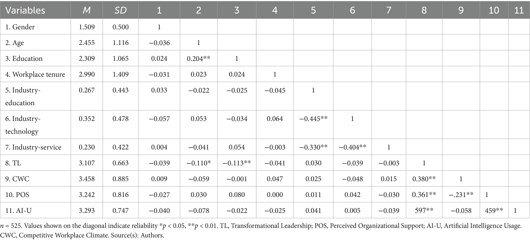 Second, descriptive statistics—including means, standard deviations, and Pearson correlation coefficients—were computed for all study variables (i.e., TL, POS, AI-U, CWC) as well as demographic and work-related control variables (gender, age, education level, tenure, and industry) using SPSS 22.0.