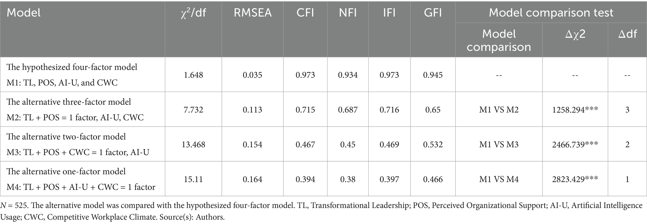 We assessed the validity of the measurement model and potential common method bias. First, convergent validity was confirmed as all constructs exhibited composite reliability (CR) values above 0.7 and average variance extracted (AVE) values above the threshold of 0.5 (Fornell and Larcker, 1981). Specifically, the CR values for TL, CWC, POS, and AI-U were 0.858, 0.896, 0.912, and 0.899, respectively, while their corresponding AVE values were 0.563, 0.602, 0.632, and 0.664. Second, discriminant validity was evaluated using the Fornell-Larcker criterion. The square root of each construct’s AVE was greater than its correlations with all other constructs (see Table 1), providing support for discriminant validity.