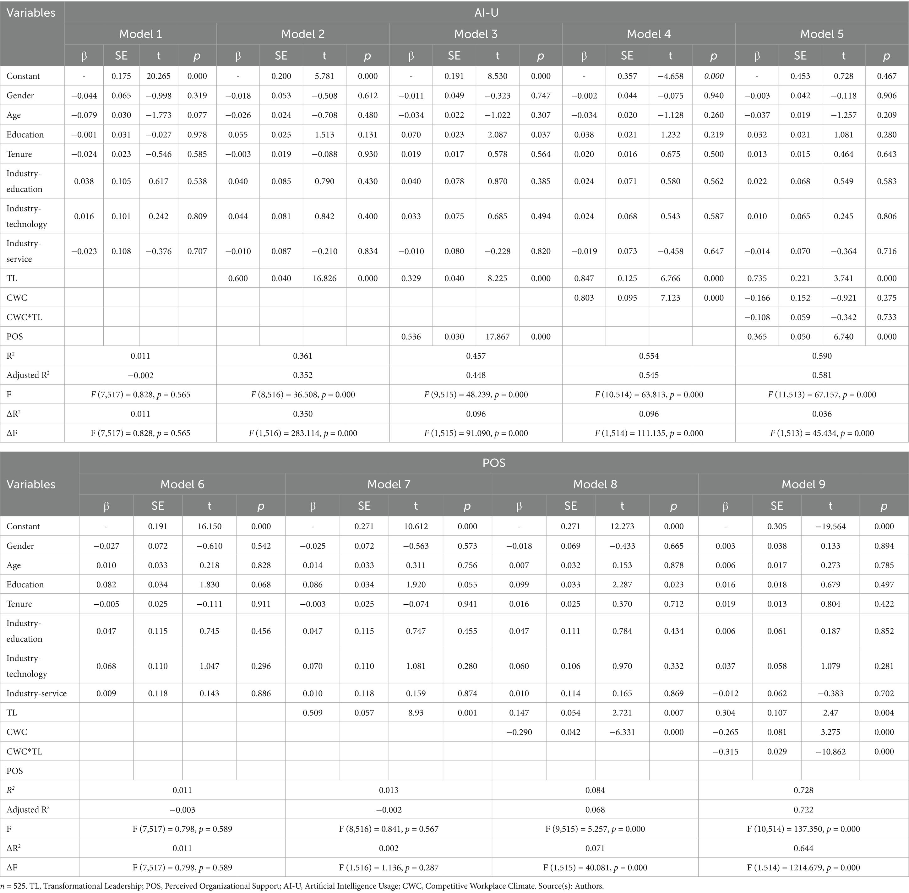 Methods: Based on social cognitive theory, this study investigates the mediating role of perceived organizational support (POS) and the moderating effect of competitive workplace climate (CWC) in the relationship between transformational leadership (TL) and employee AI-U. Data were collected from 525 employees in China through an online survey and analyzed using hierarchical regression analysis and bootstrap methods.