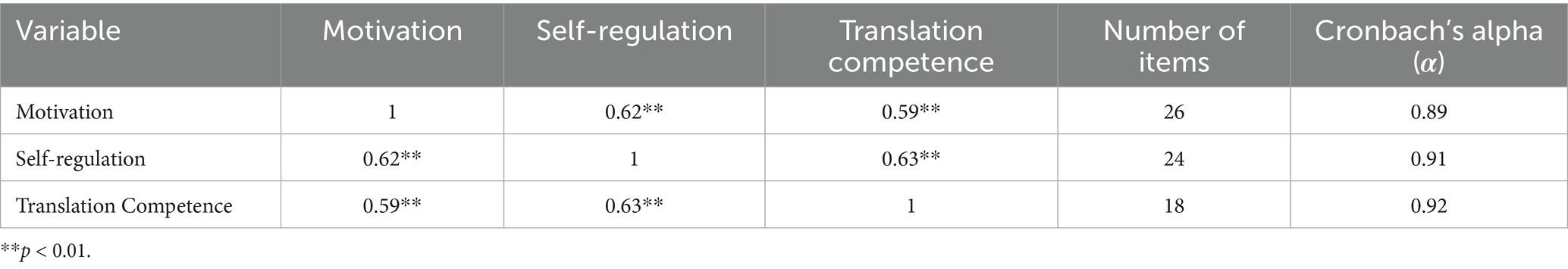 These high reliability scores confirm that the instruments used in this study are suitable for assessing the relationships between self-regulation, motivation, and translation competence, thus strengthening the credibility of the subsequent statistical findings.