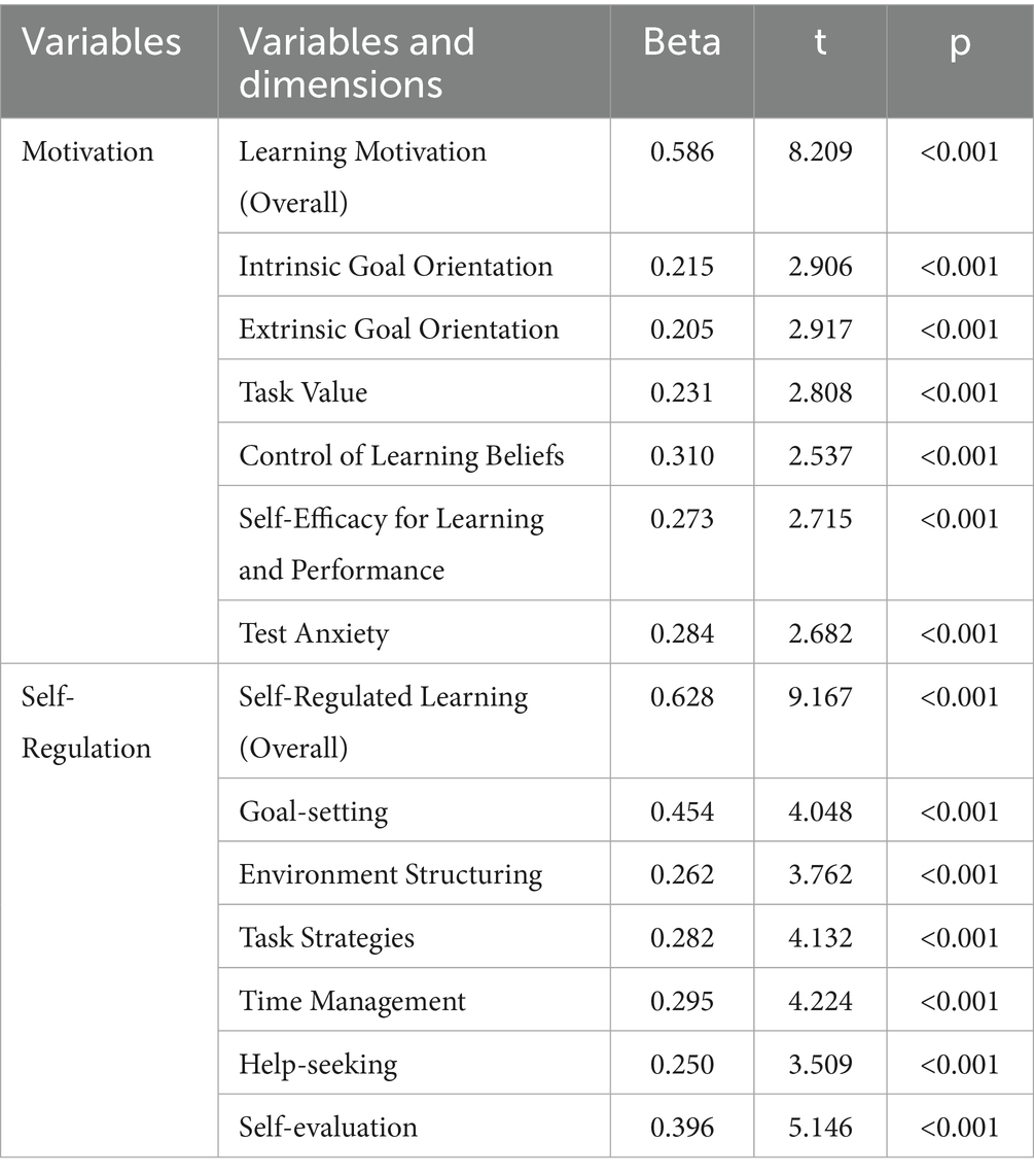 Further analysis of the sub-dimensions of self-regulation (see Table 2) provides deeper insights into which specific strategies contribute most to translation competence. Goal-setting (β = 0.454, p < 0.001) and self-evaluation (β = 0.396, p < 0.001) emerged as the strongest predictors, highlighting the importance of deliberate planning and reflective learning.