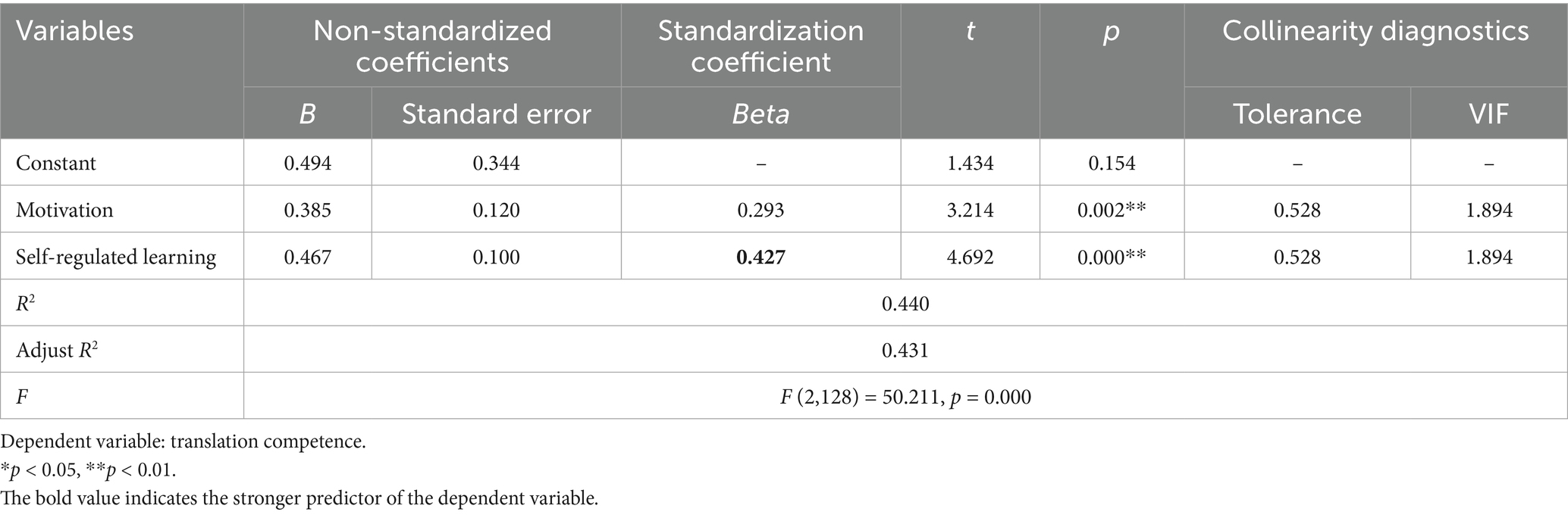 This section examines the predictive strengths of motivation and self-regulation on translation competence through multiple regression analysis, in response to the third research question. The findings have demonstrated that both motivation and self-regulation significantly influence translation competence. However, given their distinct roles in learning, it remains crucial to determine which factor serves as the stronger predictor of translation success. This distinction is particularly important for translation pedagogy, as it informs educators about which skills to prioritize in curriculum design.