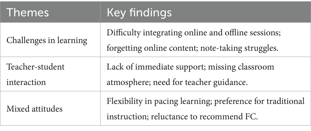 To complement the quantitative data, semi-structured interviews were conducted with a subset of participants. The interviews aimed to explore students’ perceptions of the flipped classroom model and their strategies for self-regulation and motivation. These qualitative insights enriched the study by contextualizing the quantitative findings within the participants’ lived experiences.
