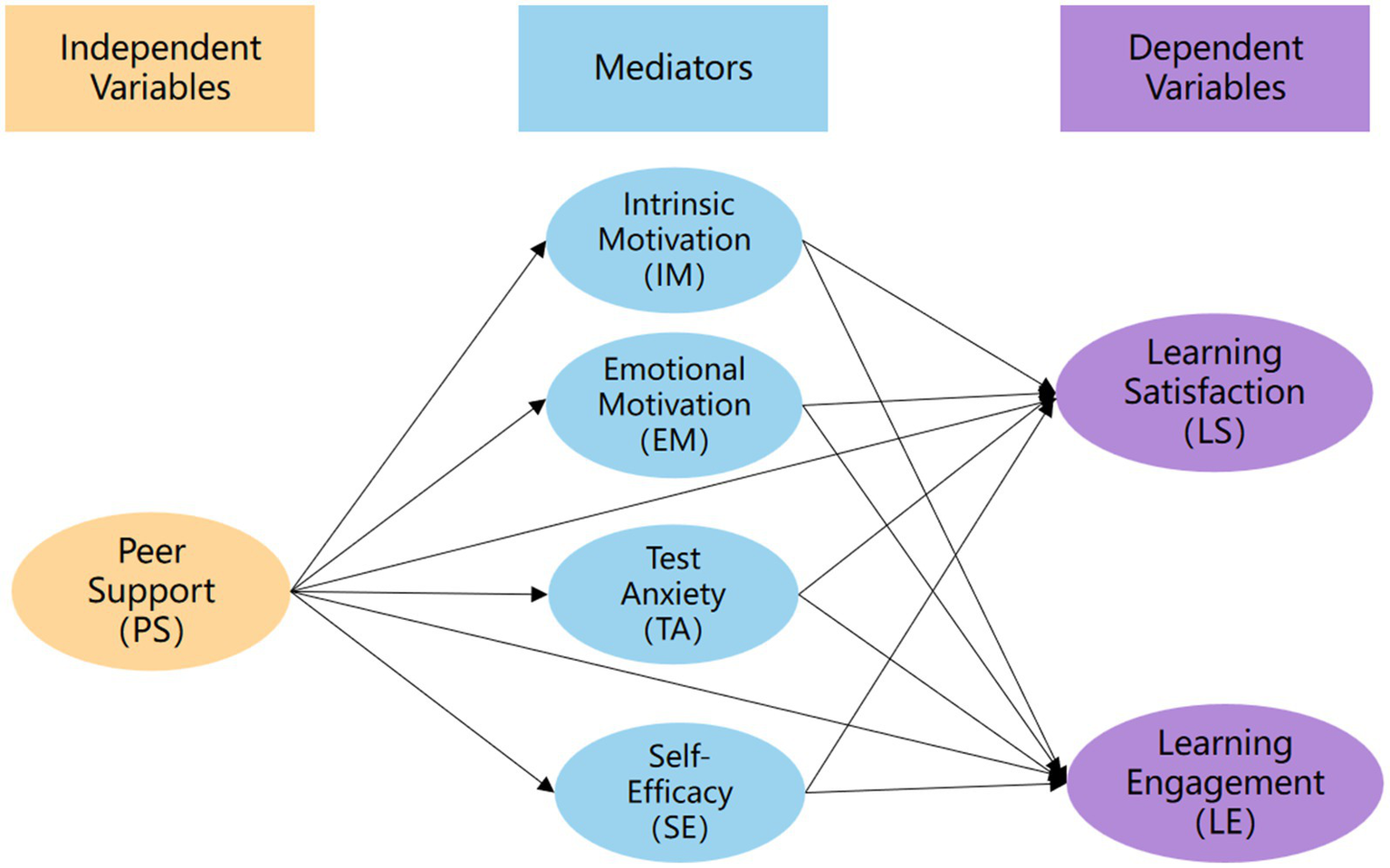 H4: Test anxiety (TA) mediates the relationship between peer support (PS) and both learning satisfaction (LS) and learning engagement (LE) in SWM.