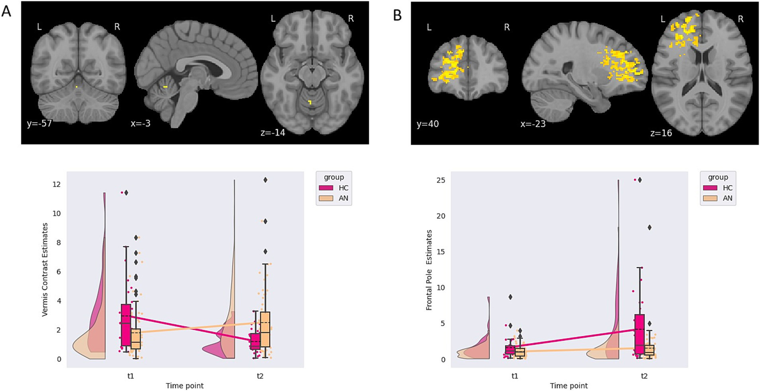 Despite the consensus from behavioural evidence supporting the importance of socio-emotional cognition in individuals with AN, how these characteristics are instantiated on a neural level is poorly understood. Findings examining socio-emotion cross-sectionally have implicated atypical functioning in a range of regions, including the fusiform, insula, and amygdala (Fonville et al., 2013a; Bang et al., 2016; Leppanen et al., 2017). However, previous research, including our previous study, has reported no whole-brain exploratory between-group differences (Halls et al., 2021). Findings exploring CC are lacking, with limited cross-sectional work implicating atypical function in the precuneus and fusiform gyrus (Fonville et al., 2013b). As our previous study reported, there were no group differences in a CC task (Leslie et al., 2021). Further compounding the confusion about the neural correlates of CC is work exploring within-AN-group correlations between areas activated in a CC task and treatment response, with no significant correlations being found (Garrett et al., 2014).