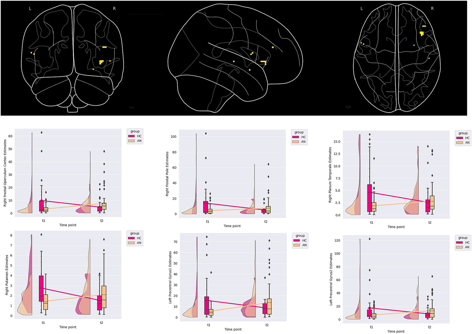 Neural changes over time in the right frontal operculum/pole potentially represent a compensatory mechanism for cognitive difficulties. Autistic characteristics in individuals with AN are instantiated and impact a wide distribution of neural regions, particularly during socio-emotional cognitive processing.