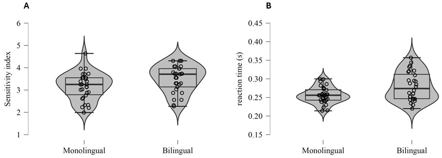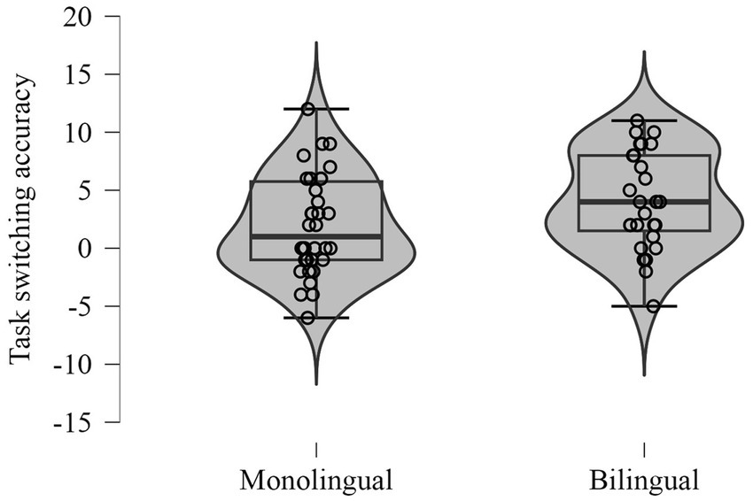 To compare EF performance between bilinguals and monolinguals, independent samples t-tests were conducted for variables meeting the assumption of equal variances, as determined by Levene’s test. For variables where the assumption of equal variances was violated, Welch’s t-tests were applied to provide a more robust comparison. These tests were conducted separately for each EF domain, enabling a detailed examination of potential differences in performance across groups. For non-normally distributed variables, Mann–Whitney U tests were used as a non-parametric alternative. Effect sizes were reported alongside p-values to provide context for interpreting the practical significance of findings. Cohen’s 𝑑 was calculated for independent samples t-tests and Welch’s t-tests, while Rank-Biserial Correlation was used for Mann–Whitney U tests.