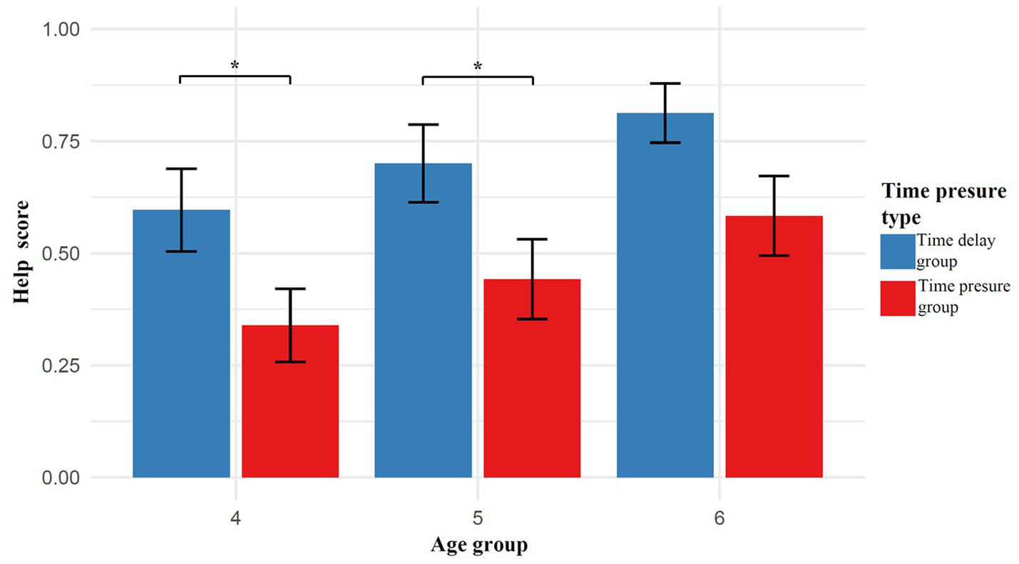 Simple effects analysis revealed no significant differences in helping behavior among 4-year-olds, 5-year-olds, and 6-year-olds under both the time pressure and time delay conditions (ps > 0.05). However, further simple effects analysis showed that, within the 4-year-old group, children in the time delay condition (M = 0.60, SD = 0.47) exhibited significantly higher helping behavior than those in the time pressure condition (M = 0.34, SD = 0.43), p = 0.029. Similarly, within the 5-year-old group, children in the time delay condition (M = 0.70, SD = 0.43) scored significantly higher than those in the time pressure condition (M = 0.44, SD = 0.45), p = 0.033. In the 6-year-old group, the difference in helping behavior between the time delay condition (M = 0.81, SD = 0.32) and the time pressure condition (M = 0.58, SD = 0.43) was marginally significant, p = 0.066.
