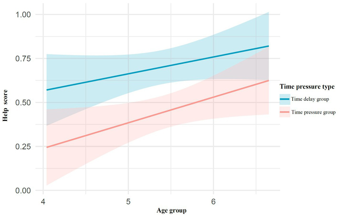 Using helping behavior scores as the dependent variable, a two-way analysis of variance (ANOVA) with 2 time pressure conditions (time pressure group, time delay group) × 3 age groups (4, 5, 6) was conducted. The results showed that age had a significant effect on helping scores, with a significant main effect of age, F(2, 150) = 3.83, p = 0.024, η2ₚ = 0.050. Post hoc multiple comparisons revealed that the helping behavior of 4-year-olds was significantly lower than that of 6-year-olds (p = 0.023), while no significant differences were found between 5-year-olds and 4-year-olds (p = 0.654) or between 5-year-olds and 6-year-olds (p = 0.429). The main effect of time pressure was also significant, F(1, 151) = 12.88, p < 0.001, η2ₚ = 0.081, indicating a highly significant difference between the time pressure group and the time delay group (p < 0.001). However, the interaction effect between time pressure and age was not significant, F(2, 147) = 0.018, p = 0.982, η2ₚ = 0.002 (Figure 2).