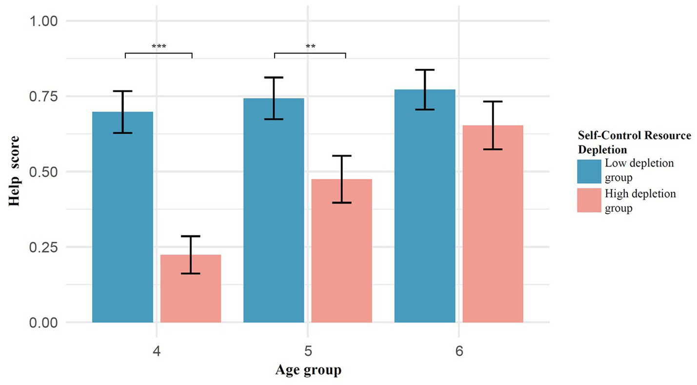 Using helping behavior scores as the dependent variable, a 2 (ego depletion: high depletion group, low depletion group) × 3 (age: 4, 5, 6) two-way analysis of variance (ANOVA) was conducted. The results showed that age had a significant effect on helping behavior scores, with a significant main effect of age, F (2, 218) = 6.42, p = 0.002, η2p = 0.056. Post hoc multiple comparisons revealed that the helping behavior of 4-year-olds was significantly lower than that of 6-year-olds (p = 0.0014), while the differences between 5-year-olds and 4-year-olds (p = 0.091) and between 5-year-olds and 6-year-olds (p = 0.319) were not significant. The main effect of ego depletion was also significant, F (1, 219) = 24.91, p < 0.001, η2p = 0.104. Under the high depletion group (M = 0.45, SD = 0.48), children’s helping behavior was significantly lower than under the low depletion group (M = 0.74, SD = 0.41). The difference between the low depletion group and the high depletion group was highly significant (p < 0.001). The interaction effect between ego depletion and age was significant, F (5, 215) = 3.16, p = 0.045, η2p = 0.029, as shown in Figure 5.
