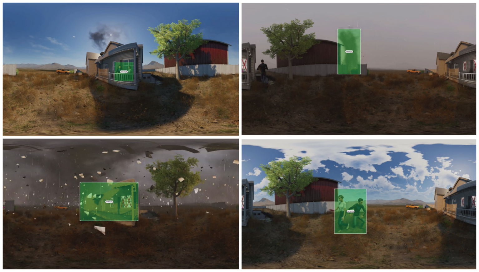 Different eye-tracking metrics can reflect distinct aspects of visual attention and cognitive load. Fixations (Joseph et al., 2021), saccades (Yu et al., 2024), and pupil diameter (Krejtz et al., 2018) are among the most commonly used measures of visual attention and cognitive load. Before outputting the above metrics, the area of interest (AOI) of the film is first delineated. In this project, since the film narrative unfolds in a 360° spatial environment, we delineate the dynamic AOI region (Figure 3) so that it constantly changes according to the development of the film narrative. The scope of the AOI region included characters, a tornado, houses destroyed by the tornado, and other parts that contain information about the main narrative content, eliminating empty scenes where no main narrative content occurs.
