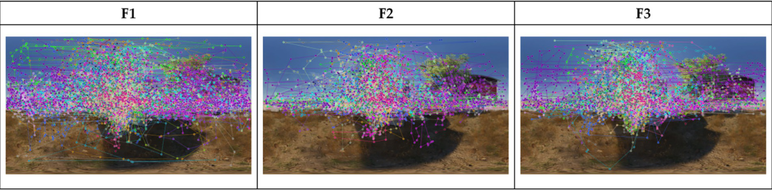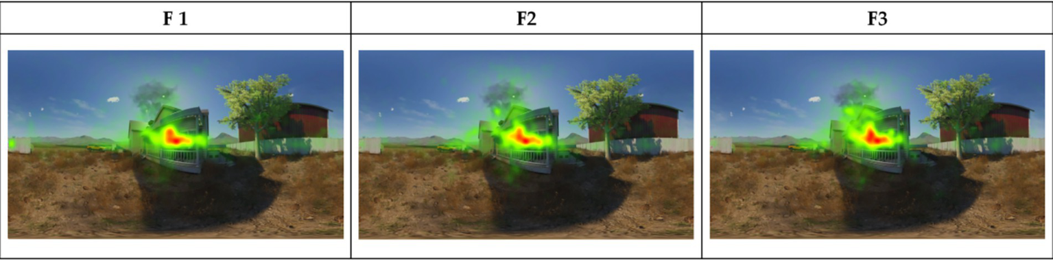 Eye-tracking technique was used in this study to test the research hypotheses. Firstly, we picked a VR movie: Tornado and storm survival on YouTube (Figure 1). This is a science popularization VR movie created by Bright Side VR, a team specializing in 360° content production. It is one of the team’s core productions. This film was chosen as the experimental material for this study due to its ability to provide highly immersive disaster experiences through immersion and presence. Using realistic CGI effects and 360° panorama technology, the film enables viewers to experience the destructive power of a tornado in a safe environment, which is a unique advantage over traditional 2D media. Produced to a high standard, the film is a classic example of the immersive appeal of VR technology, with carefully designed scenes that maintain spatial continuity. The strong sensory stimulation and narrative approach of this educational film visually convey the plot and meaning, making it easy for the audience to understand. At the same time, the film is easily accessible and meets the requirements for experimental material. It guides the storytelling through a strong and easy narrative structure, clear viewer behavioral direction, and well-defined narration. The movie was shot using a long-take technique with no editing effects. Then, three versions of the film, labeled F1, F2, and F3, were generated as experimental materials. F1 was the original film without any editing applied. In this version, viewers needed to actively search for the main narrative areas (the key storytelling regions) within the 360° field of view of the VR movie.