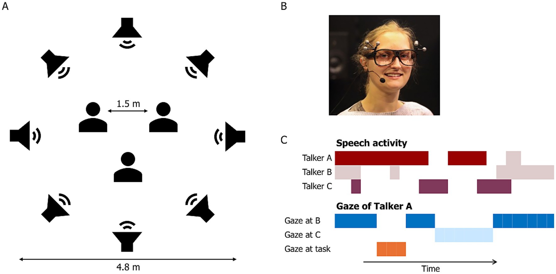 Figure 1. Experimental set-up. (A) A ring of eight loudspeakers presented 8-talker babble noise during each trial, with three participants seated in the center of the ring. (B) Each participant was equipped with eye-tracking glasses, a close-mouth microphone, and two in-ear microphones. (C) Speech activity for each participant was detected and synchronized with their gaze location and behavior.
