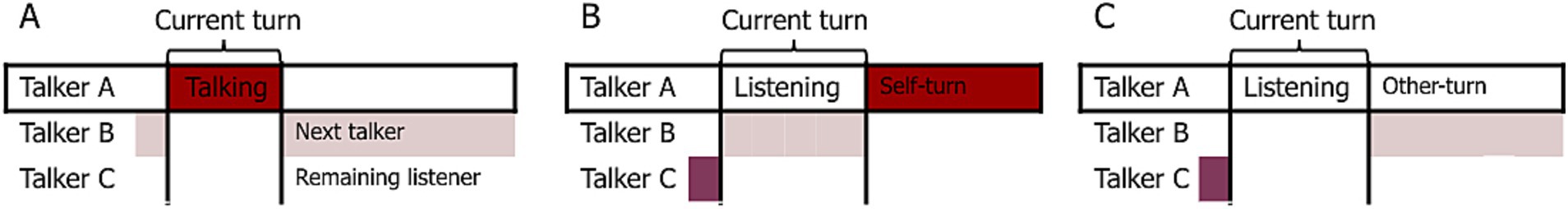 Figure 2. Roles at the offset of talking and listening from Talker A’s perspective. (A) Talker A is talking during the current turn, with Talker B designated as the next talker and Talker C remaining as the listener. (B) When Talker A is listening during the current turn, they can take the next turn themselves, referred to as a “self-turn.” (C) Alternatively, Talker A can remain listening while another participant, such as Talker B, takes the next turn, referred to as an “other-turn.”