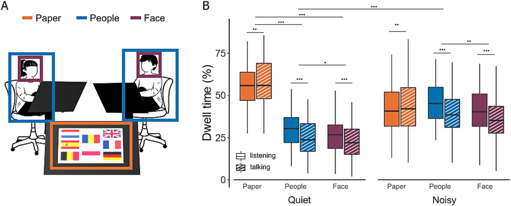Two illustrations and a box plot chart are shown. Panel A depicts two seated individuals interacting across a table with paper, people, and face areas highlighted in orange, blue, and purple. Panel B displays box plots of dwell time percentages comparing quiet and noisy conditions for paper, people, and face, with separate bars for listening and talking. Statistical significance is indicated with asterisks above the plots.