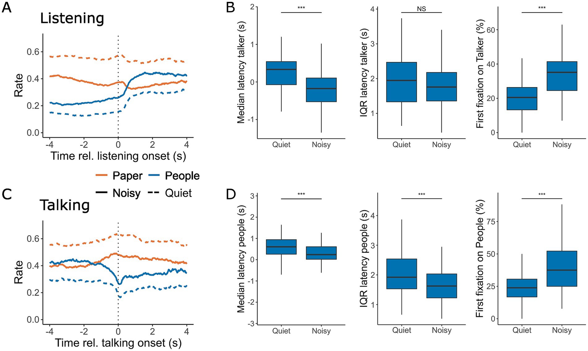 Figure 4. Gaze location at the onset of listening (A,B) and talking (C,D). (A,C) The rate at which gaze was directed toward the task material (orange) and interlocutors (blue) within a 4-s window before and after the onset of listening (A) and talking (C) during conversations in quiet (dashed line) and noisy (solid line) conditions. (B,D) The corresponding median and IQR of the latency for looking at the current talker (B) and listeners (D). Panels also display the likelihood of the first fixation after turn onset being directed toward the talker (B, right) or one of the listeners (D, right). Box plots represent the median, first and third quartiles, with whiskers indicating the minimum and maximum values. **p < 0.01, ***p < 0.001.