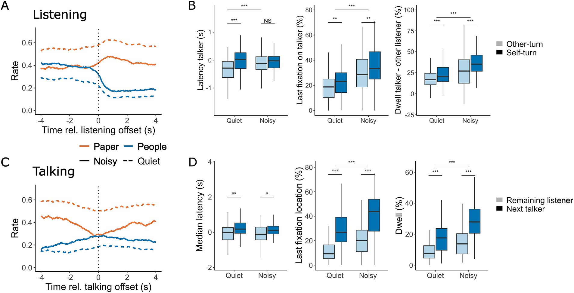 Figure 5. Gaze location at the offset of listening (A,B) and talking (C,D). (A,C) The rate at which gaze was directed towards the task material (orange) and interlocutors (blue) within a 4-s window before and after the offset of listening (A) and talking (C) during conversations in quiet (dashed line) and noisy (solid line) conditions. (B,D) The corresponding median latency for looking at the current talker (B, left) and listeners (D, left), as well as the last fixation directed toward the talker (B, middle) and listeners (D, middle) during quiet and noisy conversations. In (B) (right), the difference in dwell time between gazing at the current talker and the other listener is shown, with positive values indicating more time spent looking at the current talker. In (D) (right), dwell time directed at listeners during a talking turn is shown for both quiet and noisy conditions. In (B), light blue shading represents instances where the current listener remains listening while the other listener takes the turn, and dark blue shading represents a self-turn, where the current listener becomes the next talker. In (D), light blue shading indicates gaze directed towards the listener who remains listening, while dark blue shading indicates gaze directed towards the listener who becomes the next talker. Box plots display the median, first, and third quartiles, with whiskers indicating the minimum and maximum values. *p < 0.05, **p < 0.01, ***p < 0.001.