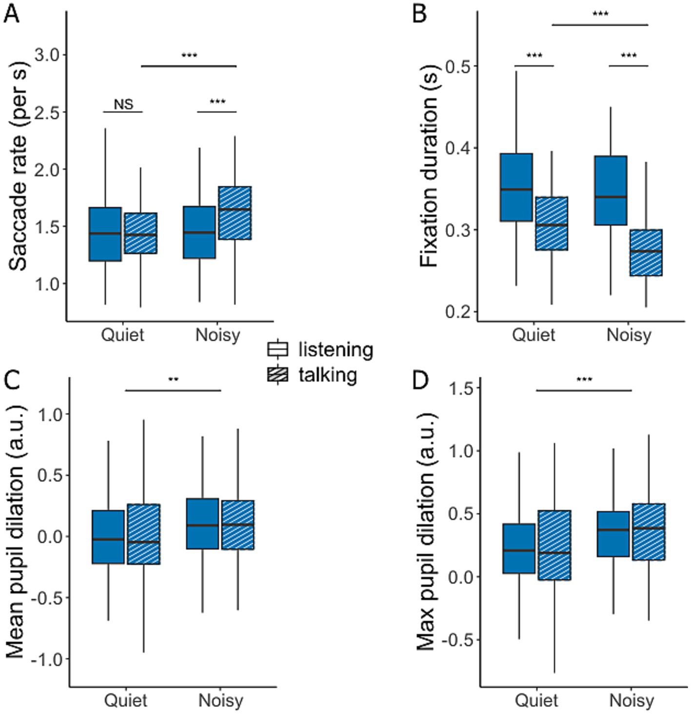 Figure 6. Saccade rate (A), mean fixation duration (B), and mean (C) and maximum pupil dilation (D) during conversations in quiet and noisy conditions. Data are presented for talking (hatched bars) and listening (filled bars). Box plots display the median, first, and third quartiles, with whiskers indicating the minimum and maximum values. *p < 0.05, **p < 0.01, ***p < 0.001.