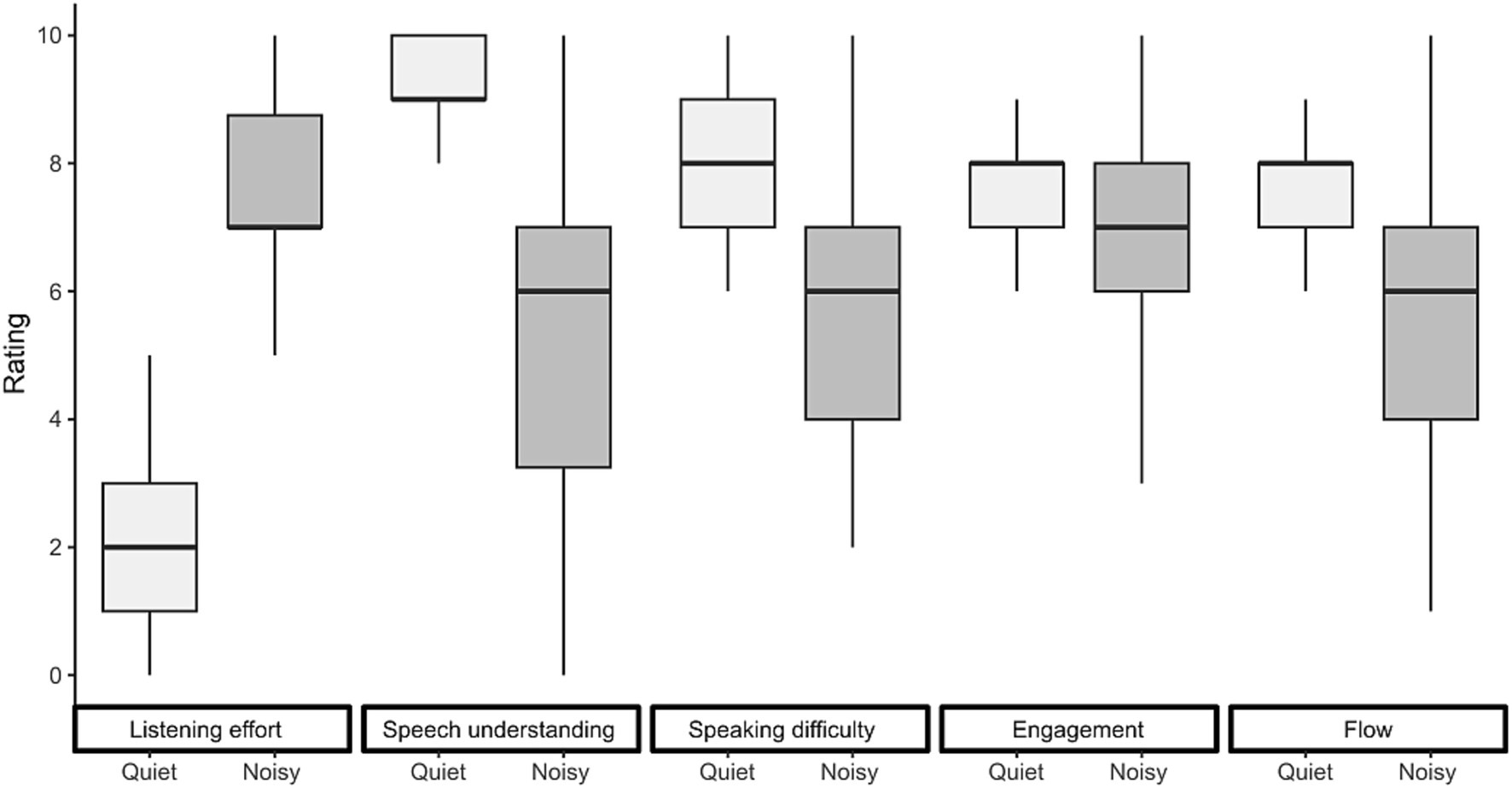 Box plot comparing ratings of listening effort, speech understanding, speaking difficulty, engagement, and flow in quiet versus noisy environments. Higher ratings indicate greater difficulty or effort, with noticeable increases in noise conditions for each category.